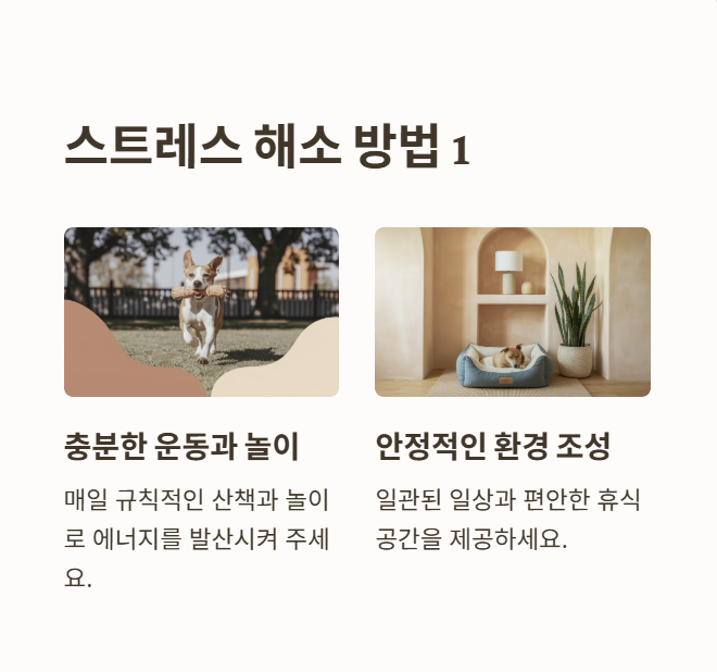 - 충분한 운동과 놀이 제공: 매일 규칙적인 산책과 놀이를 통해 에너지를 발산시켜 주세요.