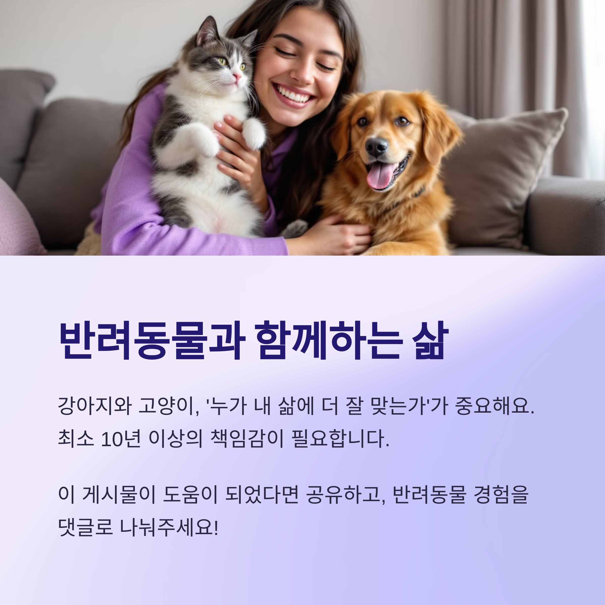 생활 패턴에 따라 달라요. 활동적이고 산책이 가능한 분에겐 강아지, 조용하고 실내 위주 생활엔 고양이가 어울립니다.