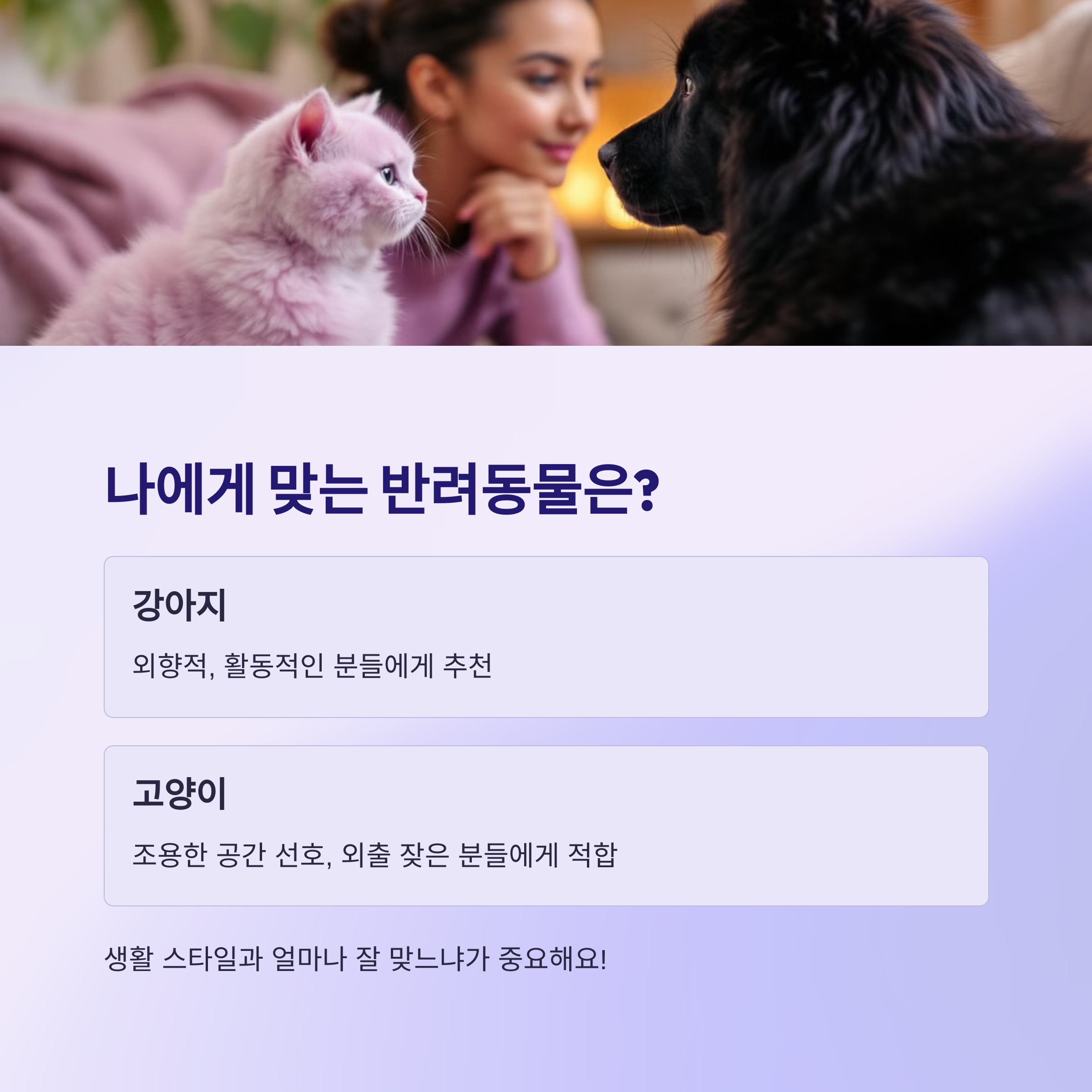 - 고양이: 실내 생활 위주, 조용한 성향의 분들에게 적합
