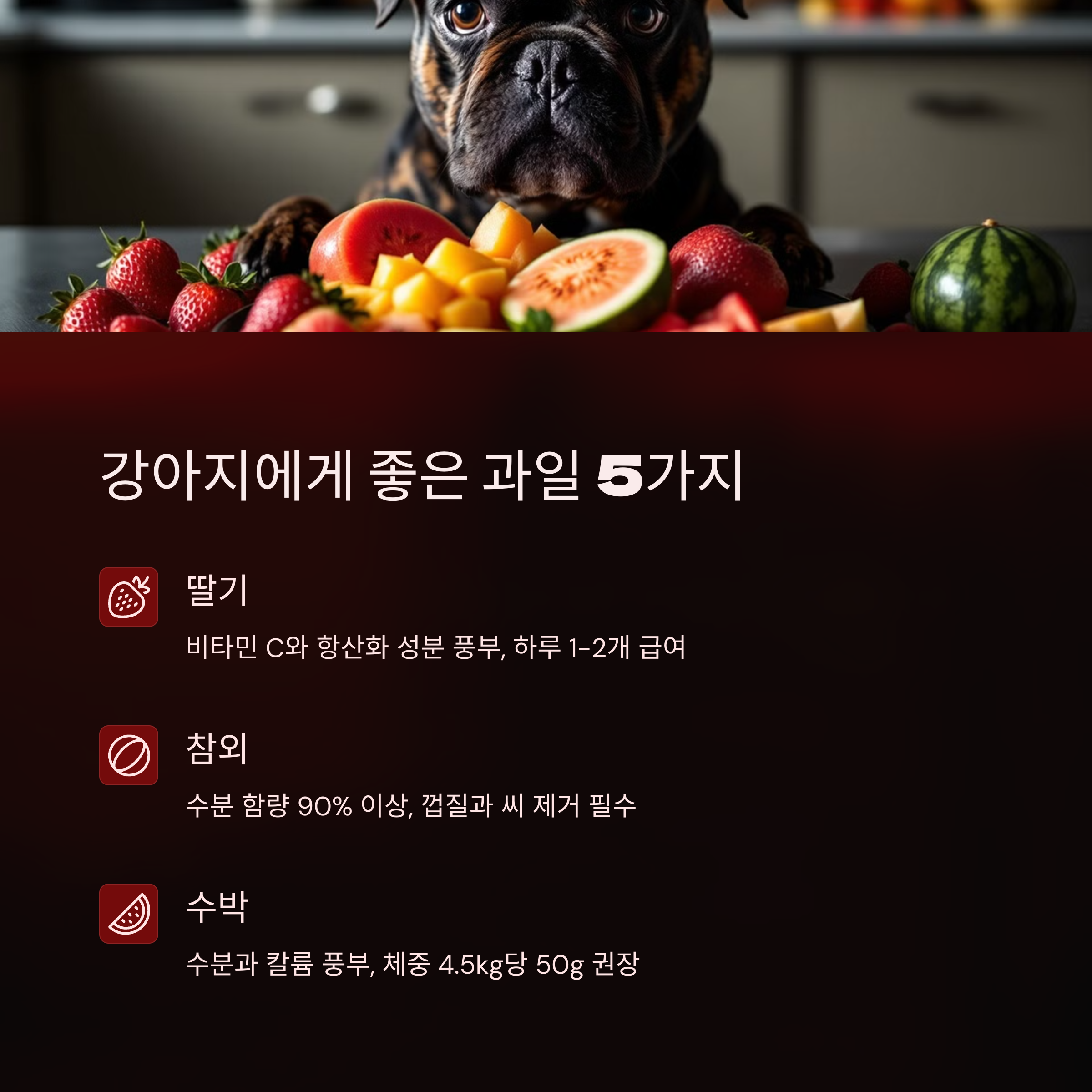 강아지에게 과일을 줄 때는 항상 '껍질 제거 → 씨 제거 → 적당한 크기로 커팅' 3단계를 거치세요. 참외나 수박처럼 수분이 많은 과일은 배변 실수를 방지하기 위해 산책 직전에는 피하는 것이 좋습니다. 매일 같은 과일보다는 2~3종류를 번갈아 주면 영양 균형을 맞출 수 있죠.