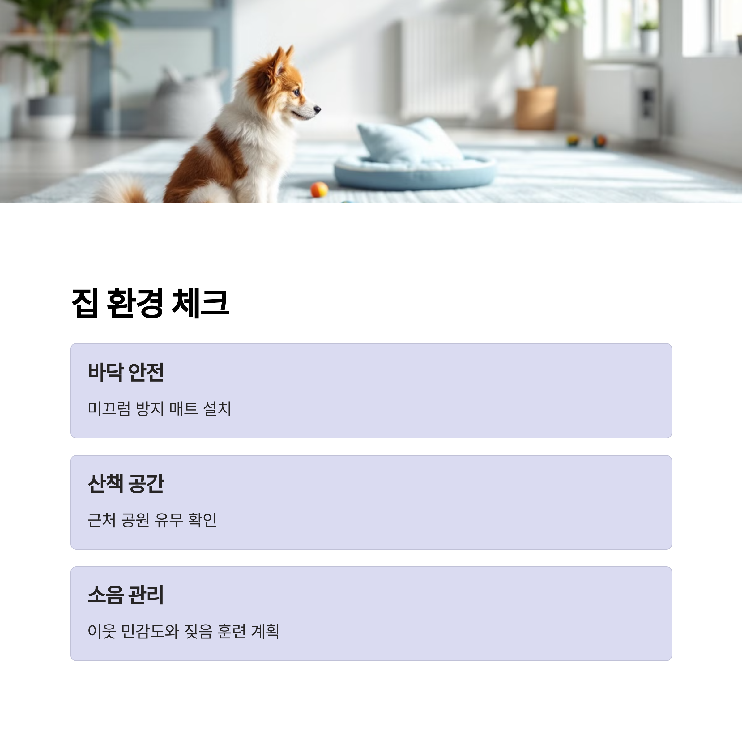 강아지의 크기, 에너지 수준에 따라 집 환경이 달라져야 해요. 아래 표는 입양 전 점검해야 할 주요 사항을 정리한 것입니다.