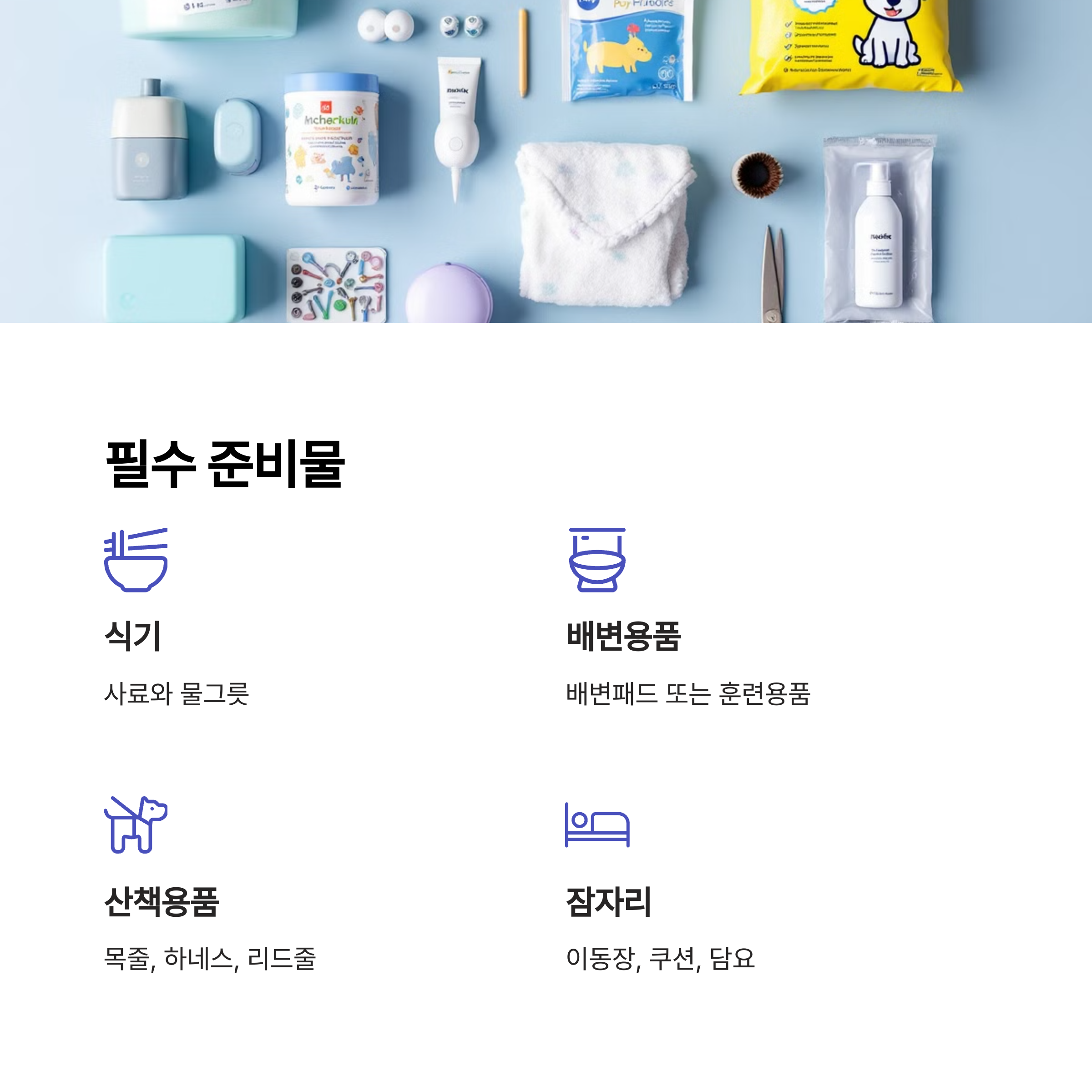 강아지를 맞이하기 전 준비물 체크는 정말 중요해요. 아래 항목들은 최소한으로 준비해야 할 필수 아이템이에요.