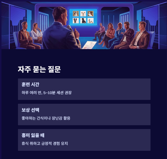 A5: 일관된 명령어와 보상을 사용하며, 인내심을 가지고 반복하여 훈련하세요. 명확한 명령어 전달이 중요합니다.