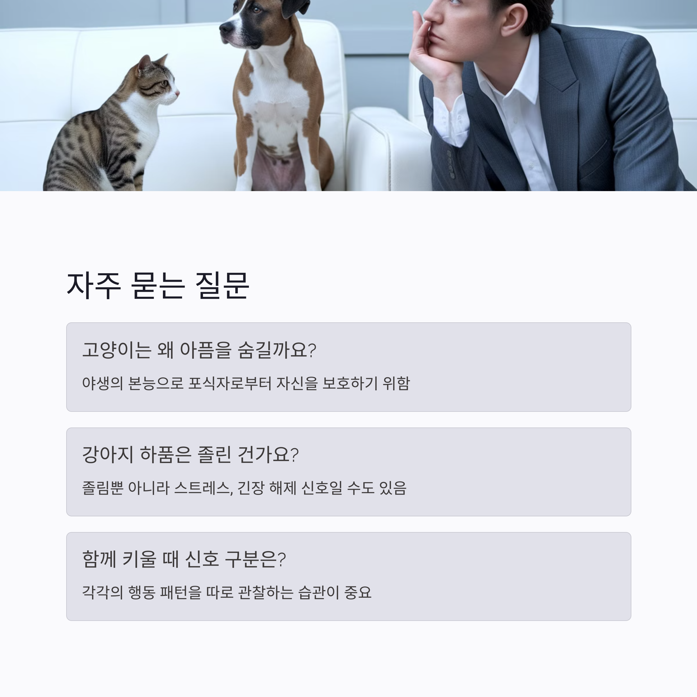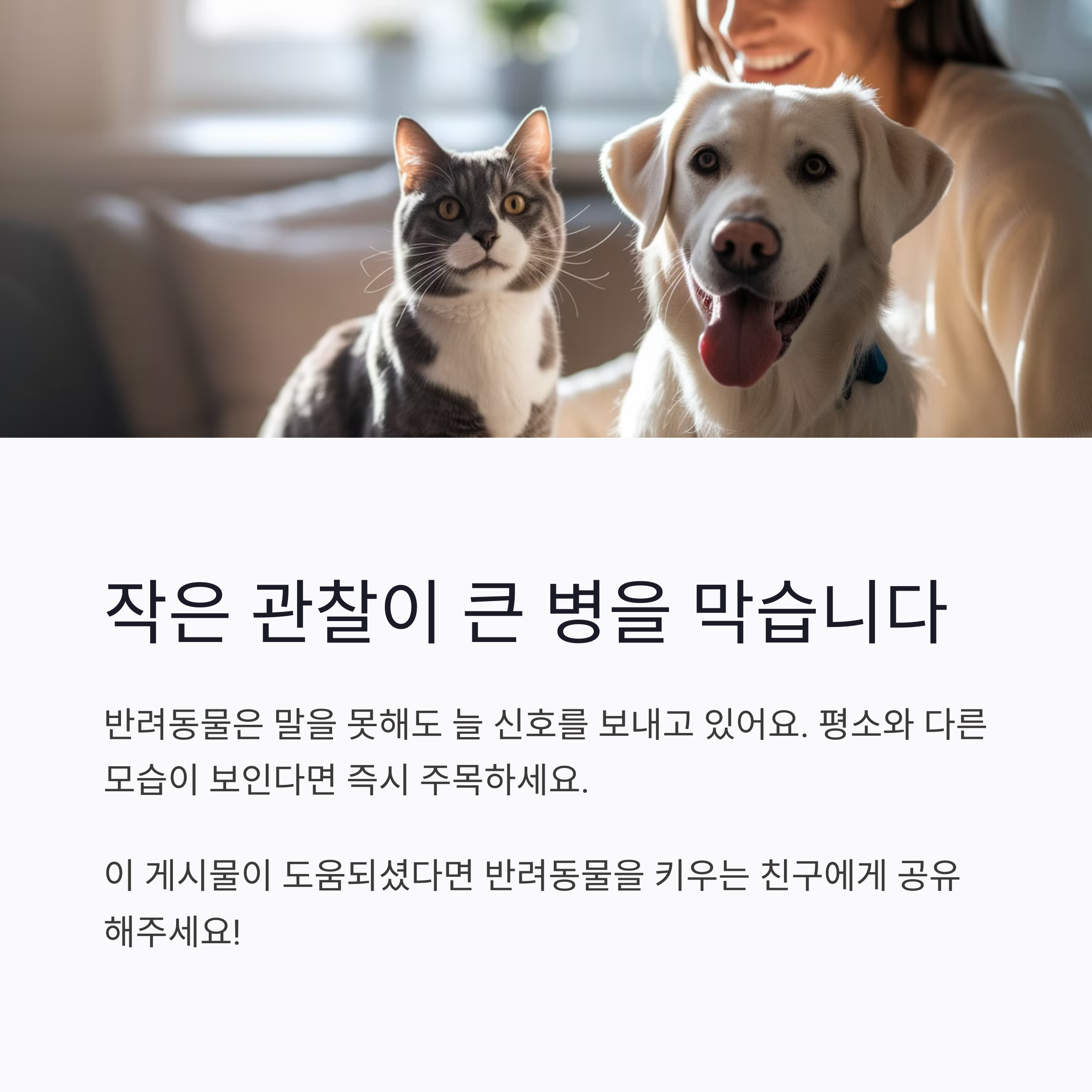 말을 못하는 우리 반려동물, 어디가 아픈지 어떻게 알 수 있을까요? 고양이와 강아지의 건강 신호는 이렇게 달라요.