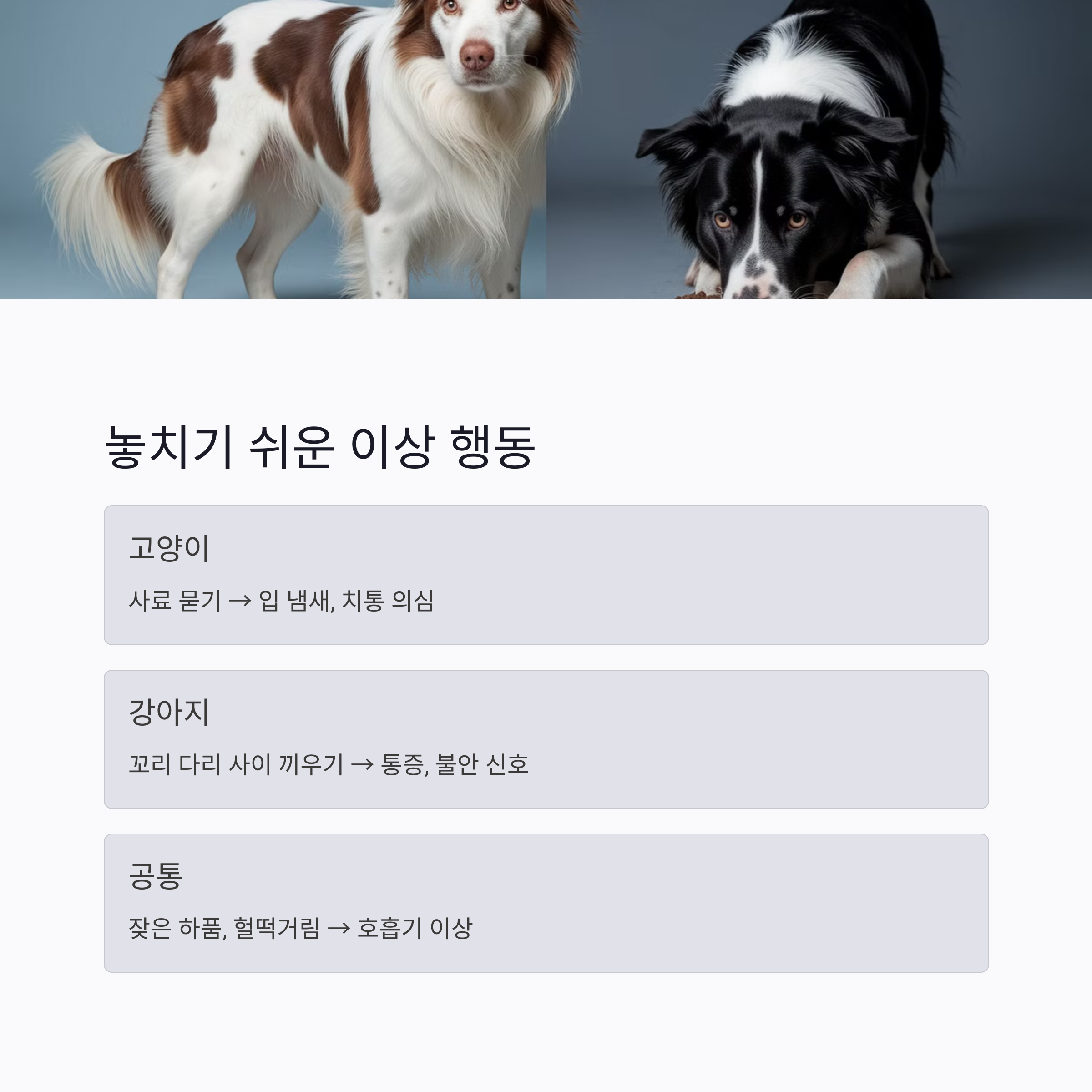 고양이와 강아지의 행동을 비교하면 병의 힌트를 더 쉽게 찾을 수 있어요. 아래 리스트는 반려인이 자주 놓치는 이상 행동들을 정리한 거예요.