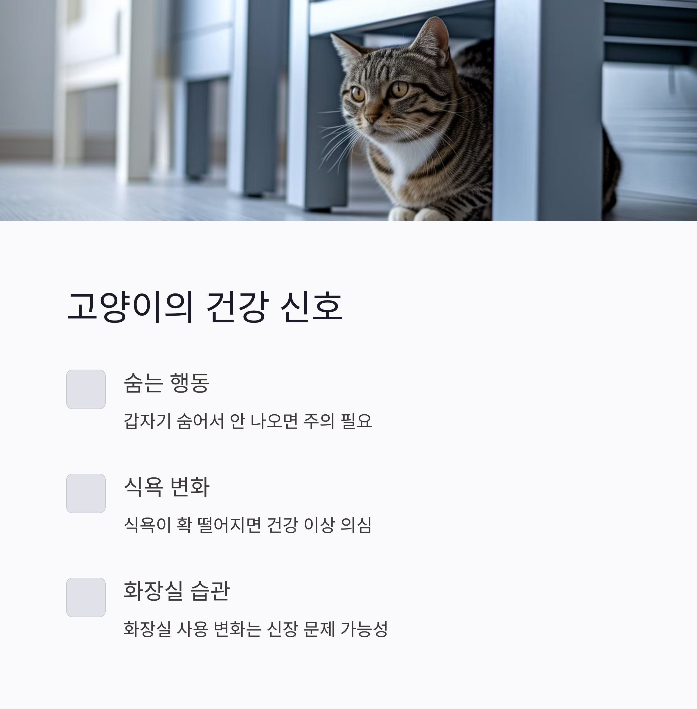 고양이는 본능적으로 아픈 걸 숨기는 습성이 있어요. 그래서 평소보다 조금만 다른 행동을 보여도 주의 깊게 봐야 해요. 예를 들어, 갑자기 숨어서 안 나오거나 식욕이 확 떨어진다면 단순한 기분 변화가 아닐 수 있답니다. 또한 평소와 달리 구석에서 조용히 있거나, 화장실 사용에 변화가 생기면 위장이나 신장 쪽 문제일 가능성도 있어요.