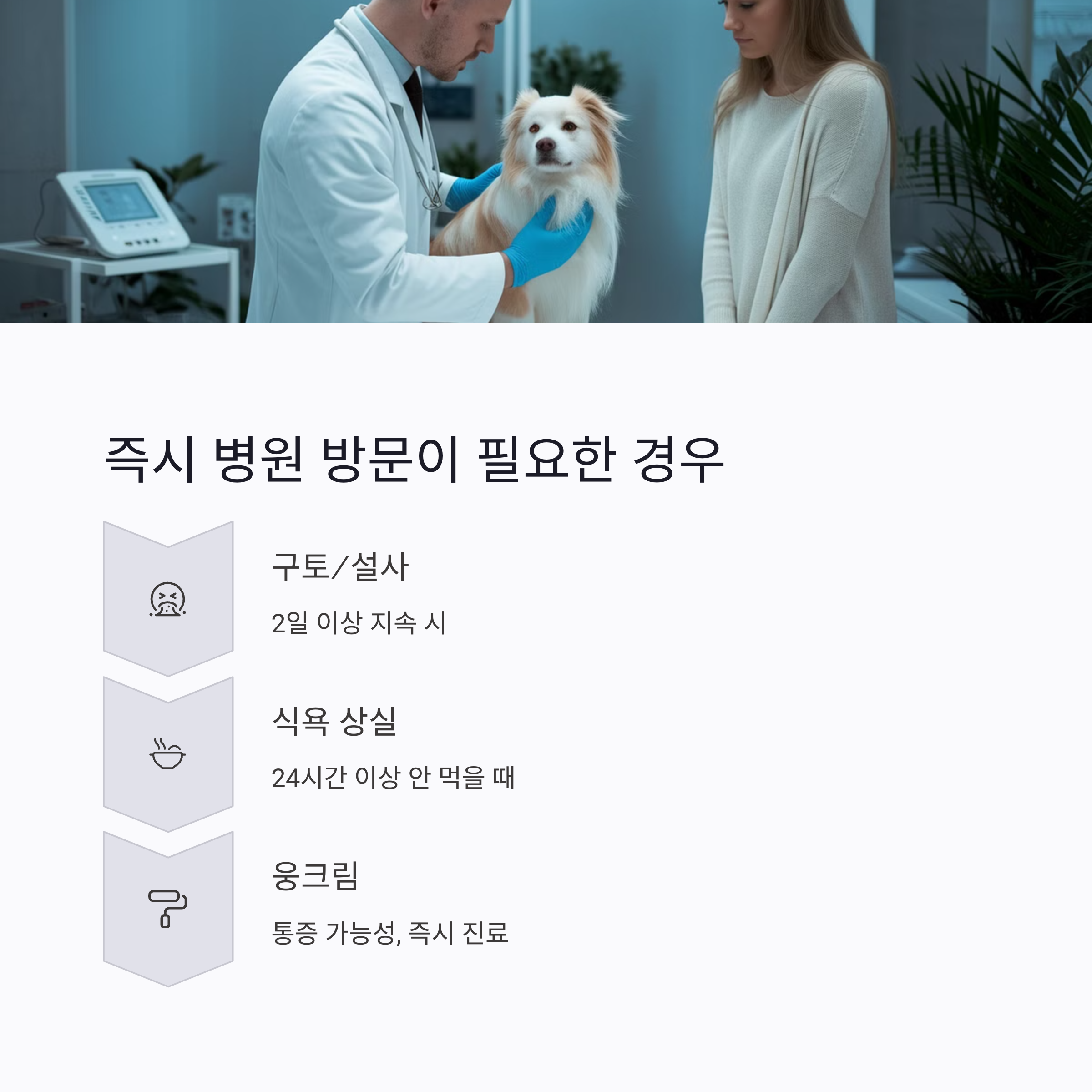 1~2일 이상 증상이 지속되거나 평소와 다른 행동을 반복하면 지체 없이 가야 해요. 조기 진단이 생명을 살릴 수 있어요.