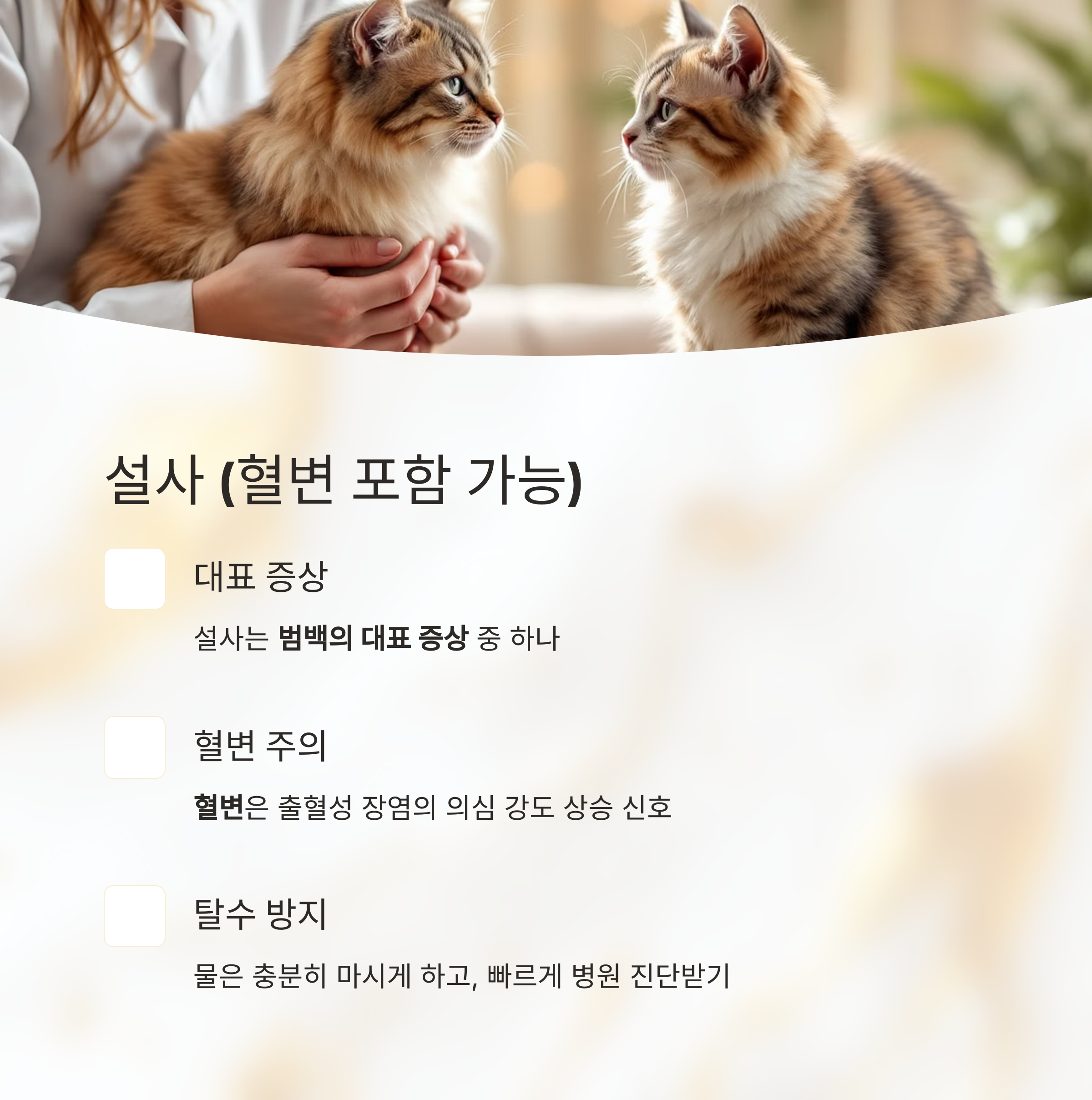 - 설사·구토 후 고양이가 입술·코가 건조해지고, 피부 탄력이 떨어지면 탈수 가능성이 높아요.