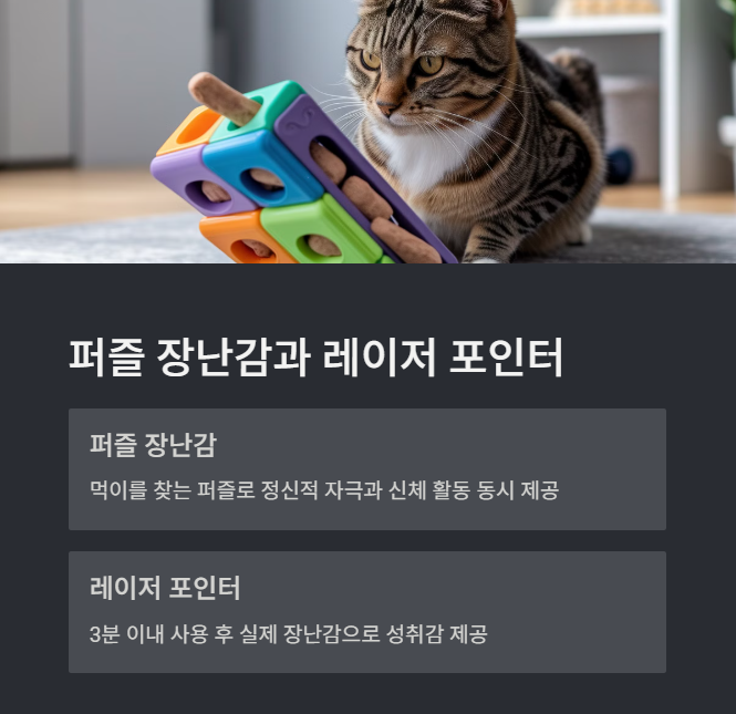 빛을 쫓는 레이저 놀이 후 반드시 실제 장난감(쥐 모양 등)을 잡을 수 있게 해 성취감을 주세요. 레이저 단독 사용은 스트레스를 유발할 수 있으므로 3분 이내로 제한하고 마무리 시 tangible 보상을 제공하는 것이 핵심입니다.