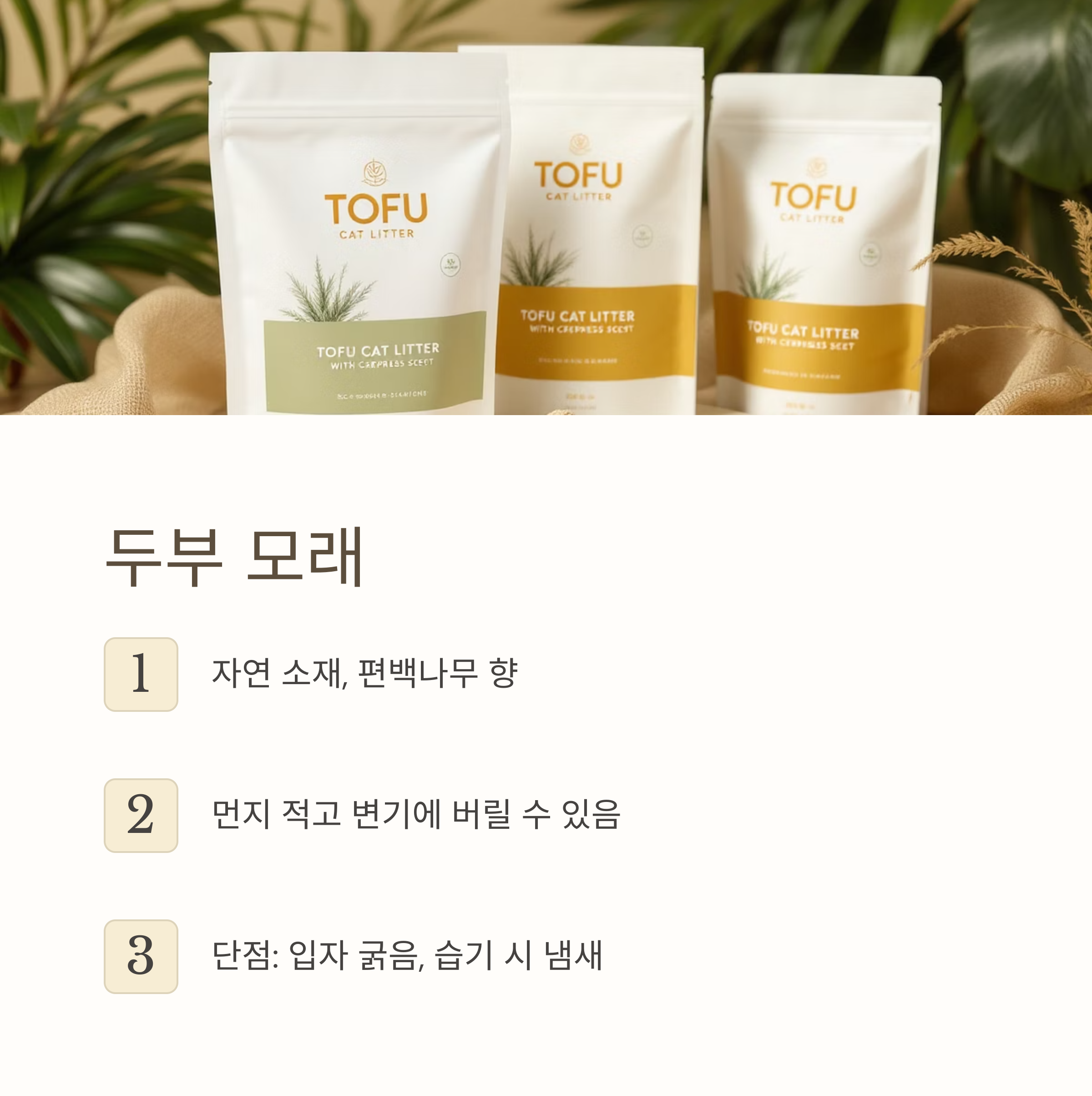 | 두부 모래 | 식물성 부산물, 응고형 | 먼지 적음, 변기에 소량 버릴 수 있음, 관리 편함 | 입자 굵어 일부 고양이 거부, 습기 많으면 냄새 날 수 있음 |
