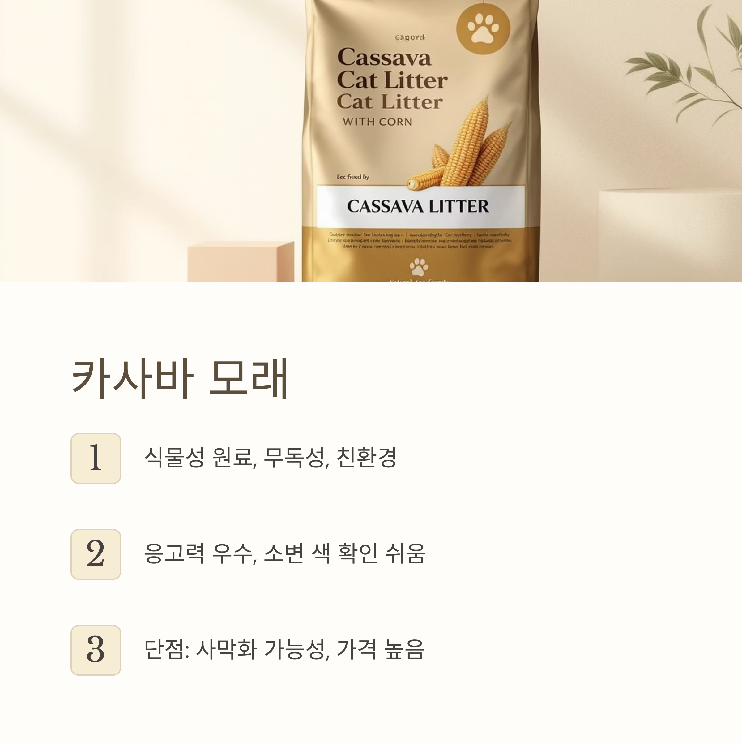 | 카사바 모래 | 카사바+옥수수, 식물성 응고형 | 먼지 거의 없음, 응고력 우수, 무독성, 친환경, 소변 색 확인 가능 | 입자 고와 사막화 약간, 가격대 높음, 일부 고양이 적응 필요 |