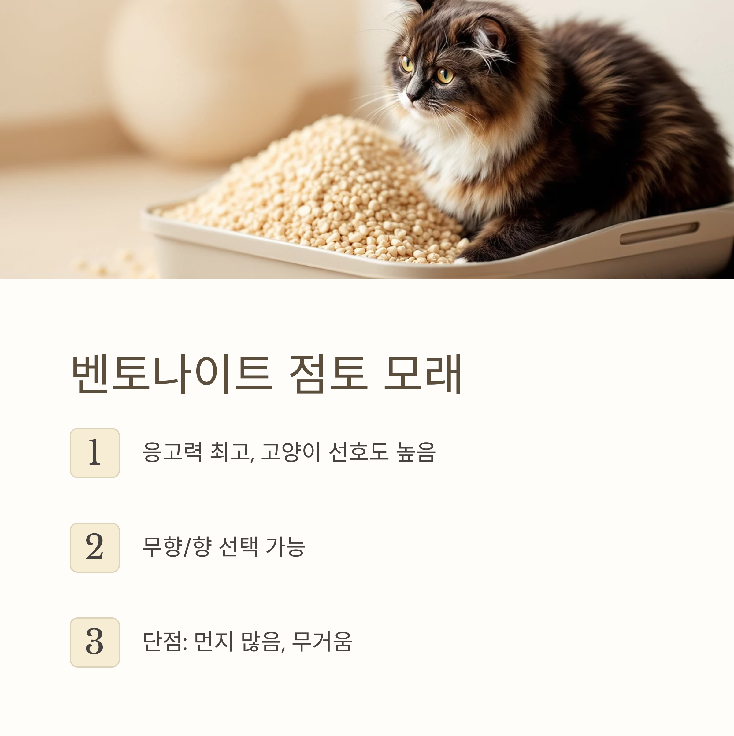 | 벤토나이트 | 점토 광물, 응고형 | 실제 모래와 유사, 응고력 우수, 고양이 선호도 높음 | 먼지 날림 많음, 사막화 현상, 무게감 있음 |