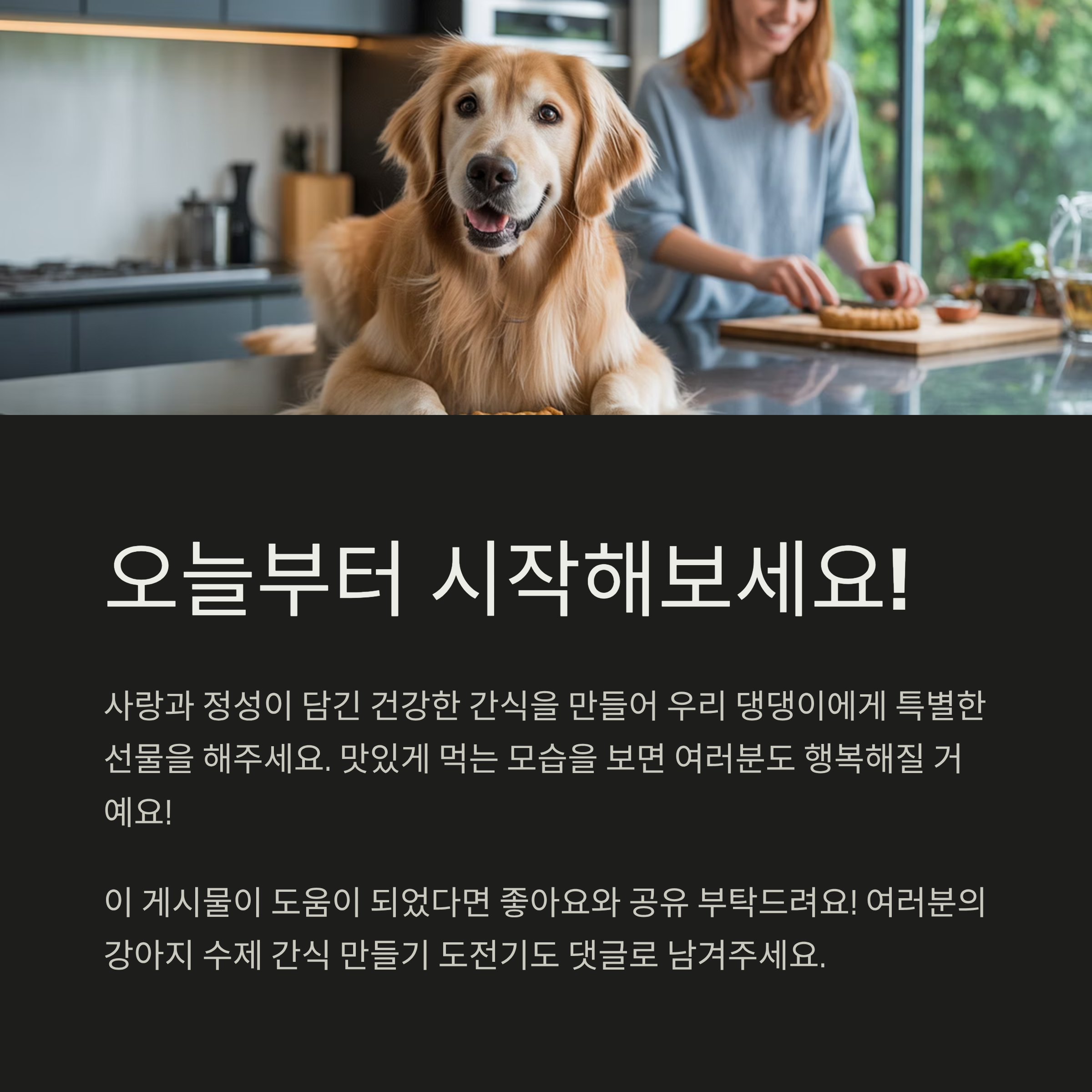 이제 자신감이 좀 생기셨나요? 우리 댕댕이를 위한 특별한 강아지 수제 간식 만들기! 오늘 소개해 드린 초간단 레시피 3가지로 사랑과 정성이 담긴 건강한 간식을 만들어 보세요. 우리 강아지가 맛있게 먹는 모습을 보면 여러분도 행복해질 거예요!