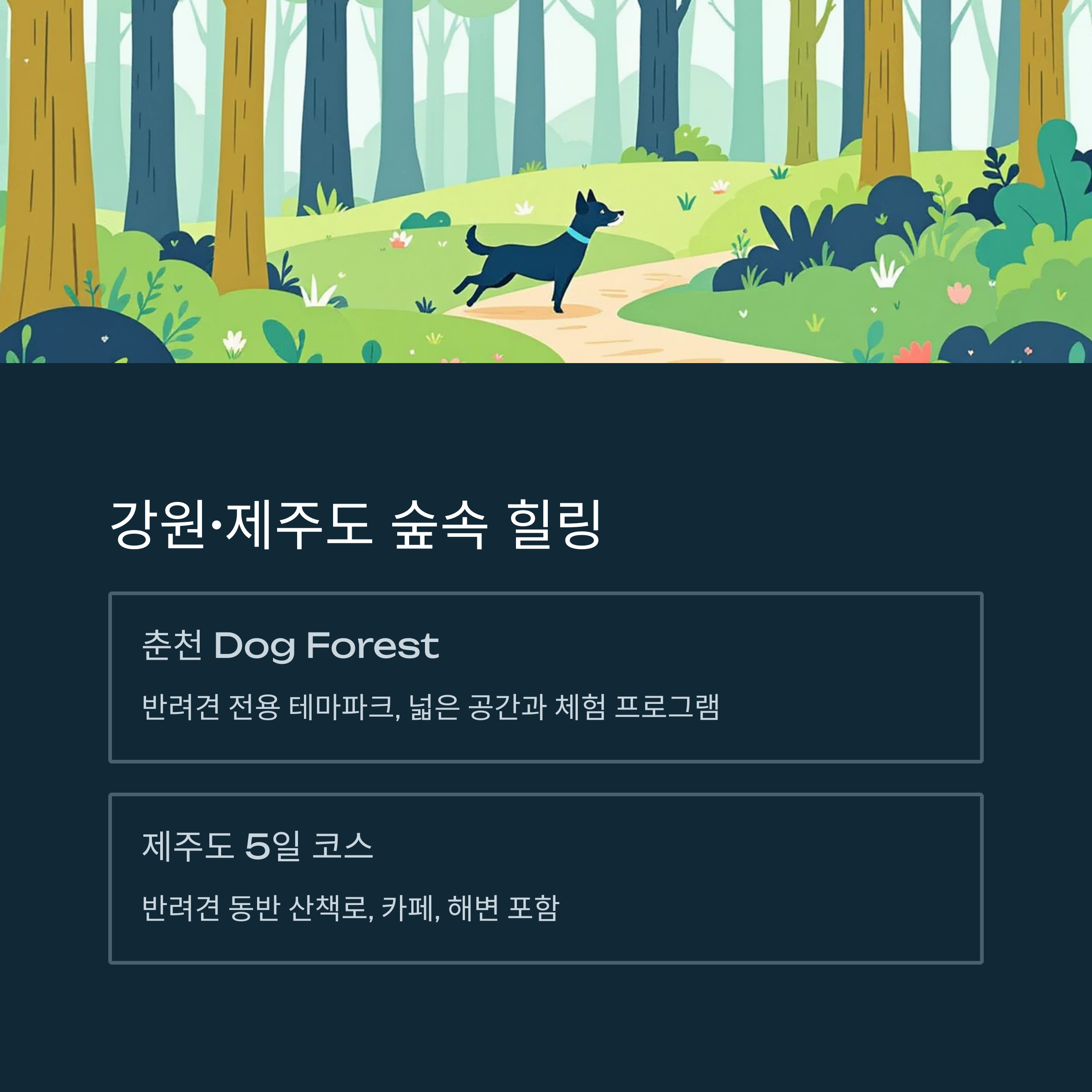 - 춘천 Dog Forest 테마파크: 반려견이 뛰어놀 수 있는 넓은 공간과 체험 프로그램 **