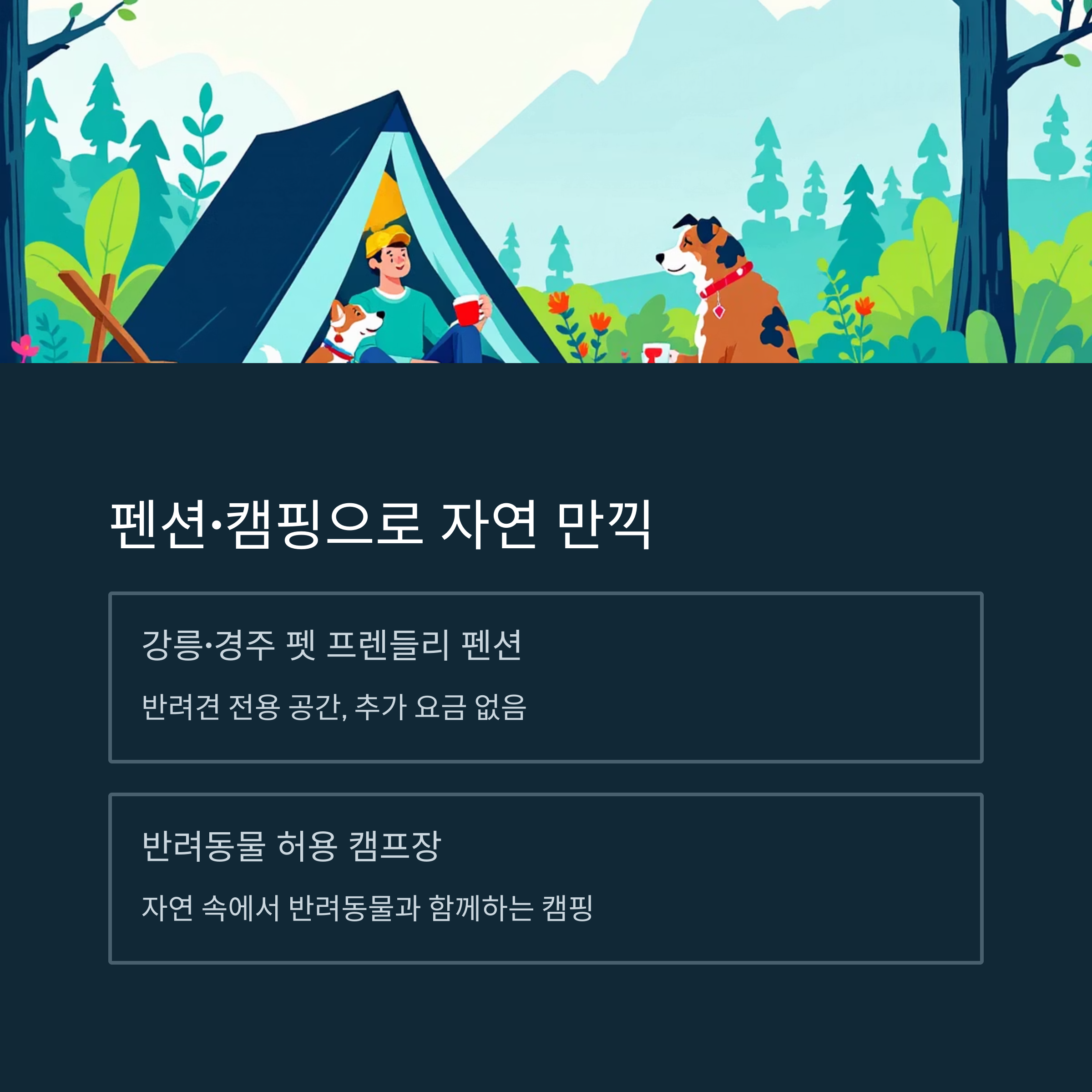 - 펫 동반 여행지: 해변, 호수, 숲, 테마파크, 펜션 등 다양한 선택지