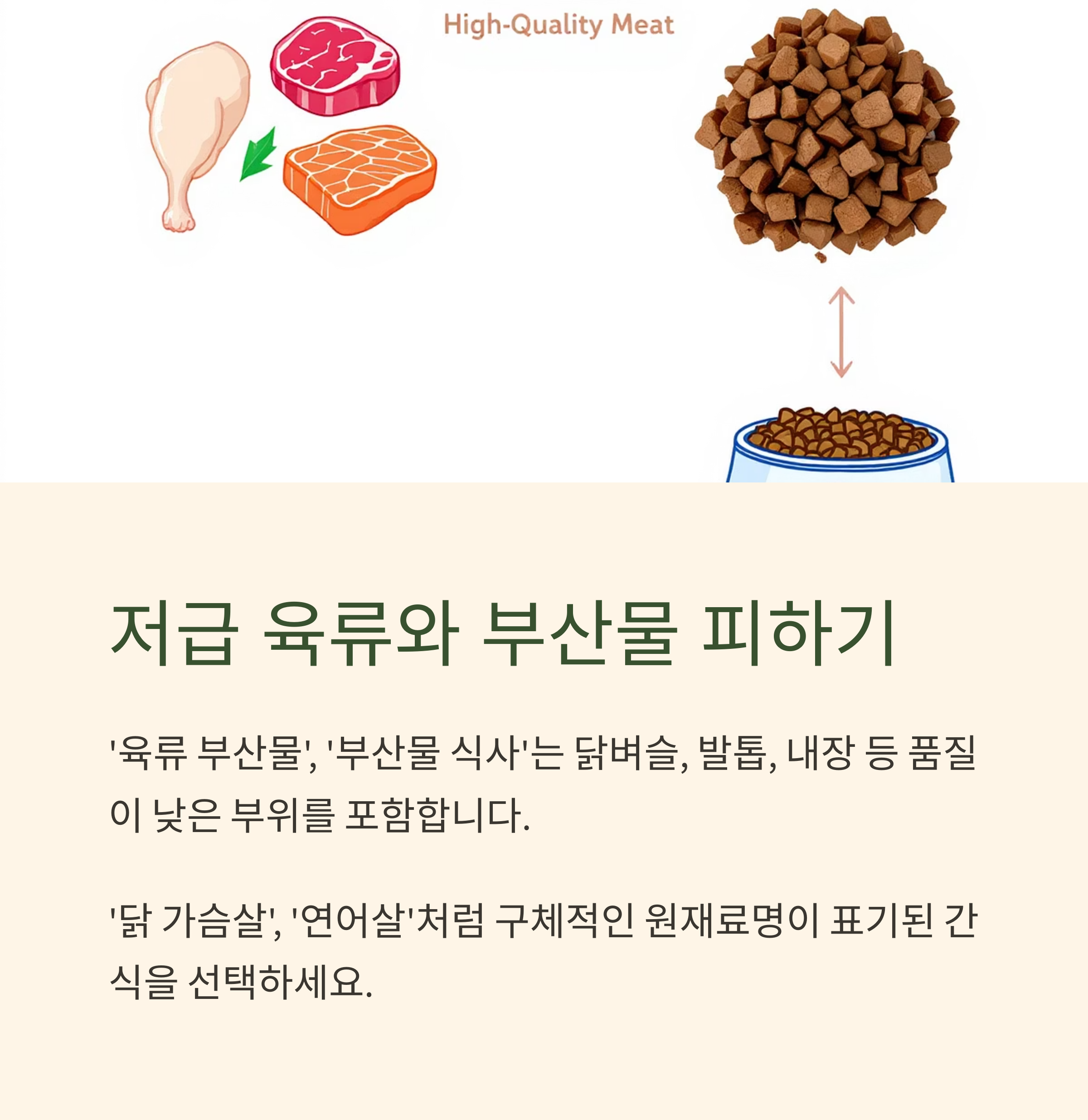 부산물 라벨에 '육류 부산물', '부산물 식사'라고 표기된 제품은 닭벼슬, 발톱, 깃털, 내장 등 품질이 낮은 부위를 포함할 수 있습니다. 이는 단백질 함량은 유지하되 소화율이 낮고 알레르기 유발 가능성이 큽니다. '닭 가슴살', '연어살'처럼 구체적이고 명확한 원재료명이 표기된 간식을 고르는 것이 안전합니다.