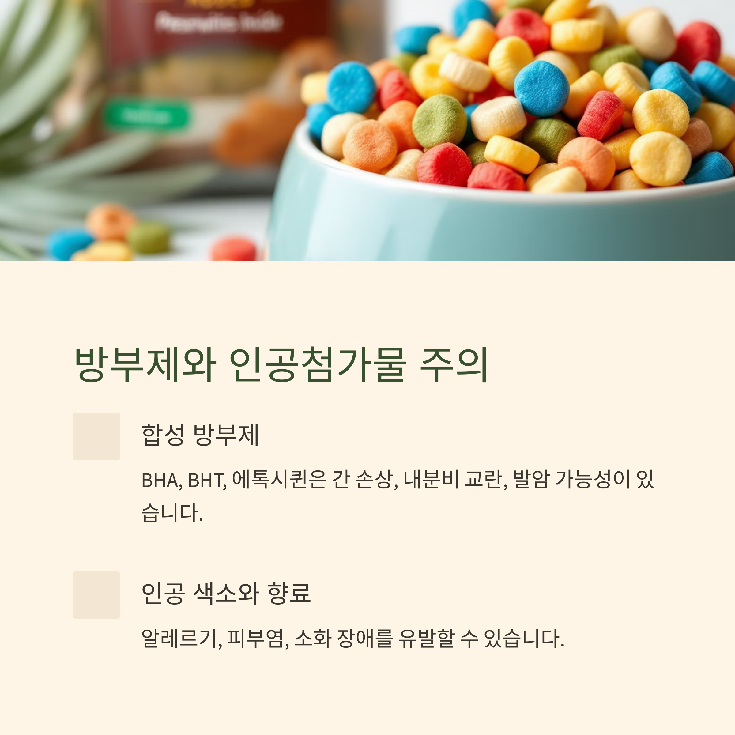 장기 보관을 위해 사용되는 BHA, BHT, 에톡시퀸 등의 합성 방부제는 실험에서 간 손상, 내분비 교란, 발암 가능성과 연관된 사례가 보고되었습니다. 또, 아조계 색소, 타르 색소 등 인공 색소와 인공 향료는 알레르기, 피부염, 소화 장애를 유발할 수 있습니다. 원재료 본연의 색과 향을 살린 간식을 선택하는 것이 좋습니다.