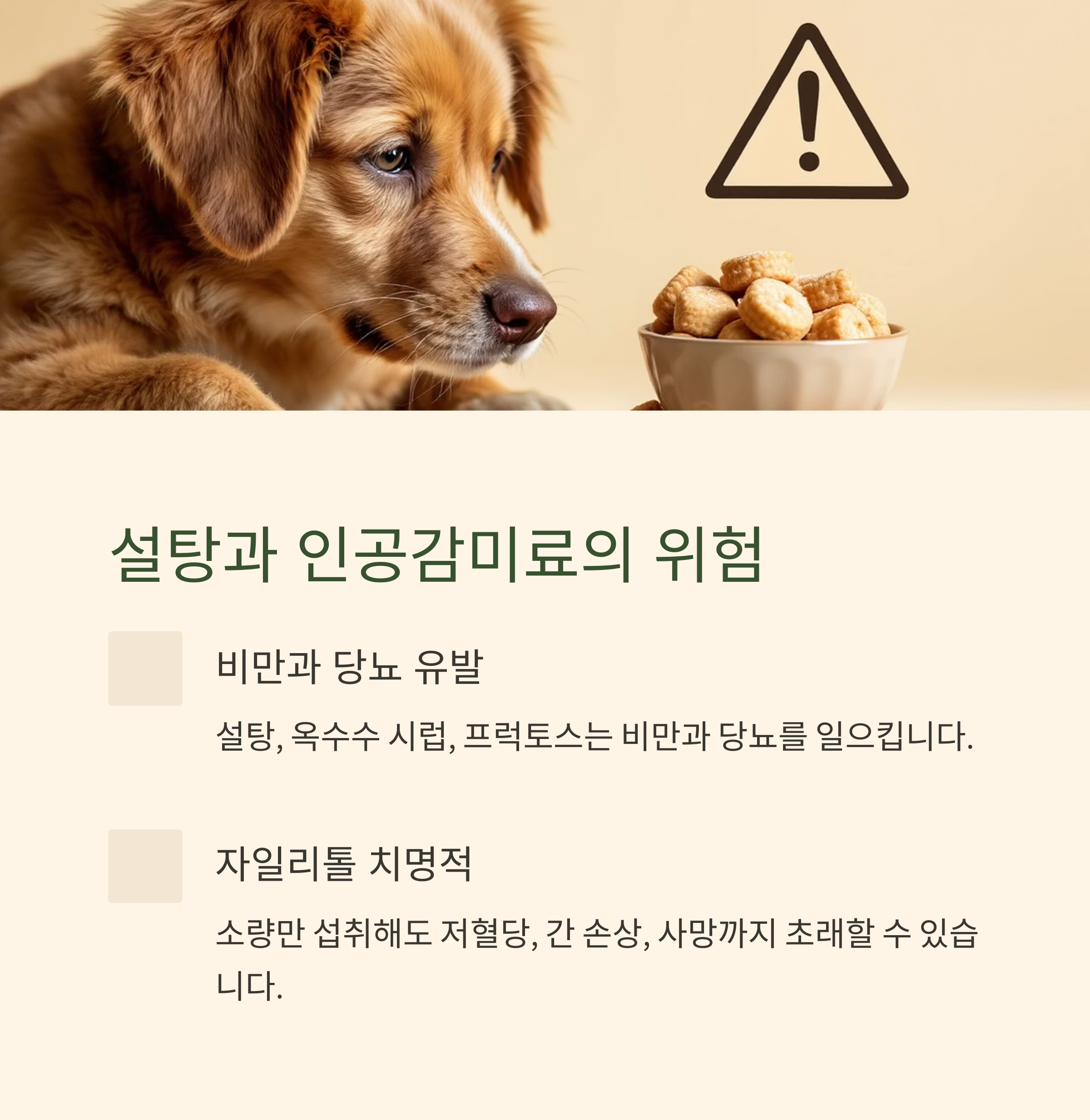 많은 반려동물 간식에 당류가 포함되어 있습니다. 설탕, 옥수수 시럽, 프럭토스 등의 첨가는 반려동물의 비만, 당뇨, 치아질환을 유발할 수 있습니다. 특히 자일리톨은 소량만 섭취해도 반려견에게 저혈당, 간 손상, 심지어 사망까지 초래할 수 있어 절대 금물입니다. 고양이도 과도한 당류 섭취 시 췌장 질환 위험이 증가합니다.