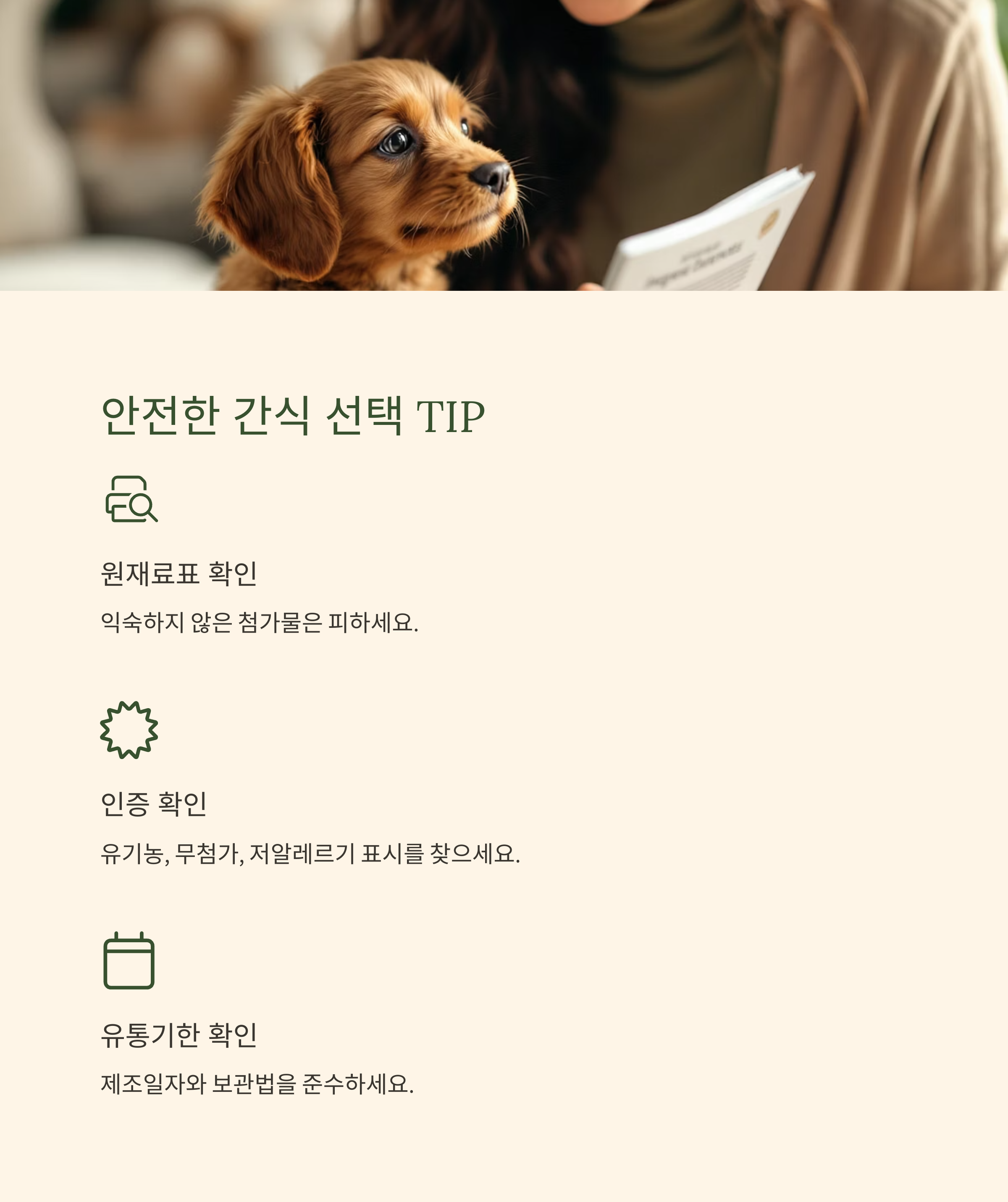 - 처음 주는 간식은 적은 양으로 시작해 이상 반응이 없는지 확인하세요.