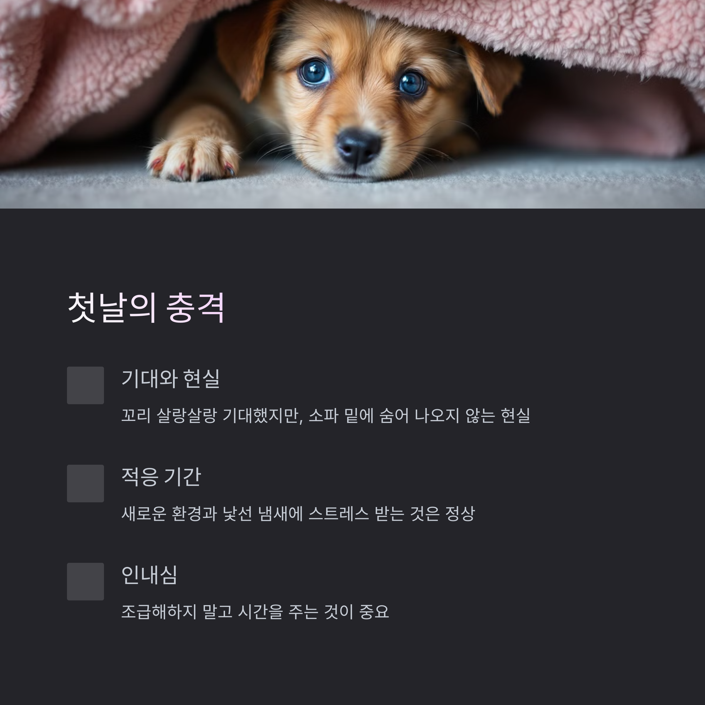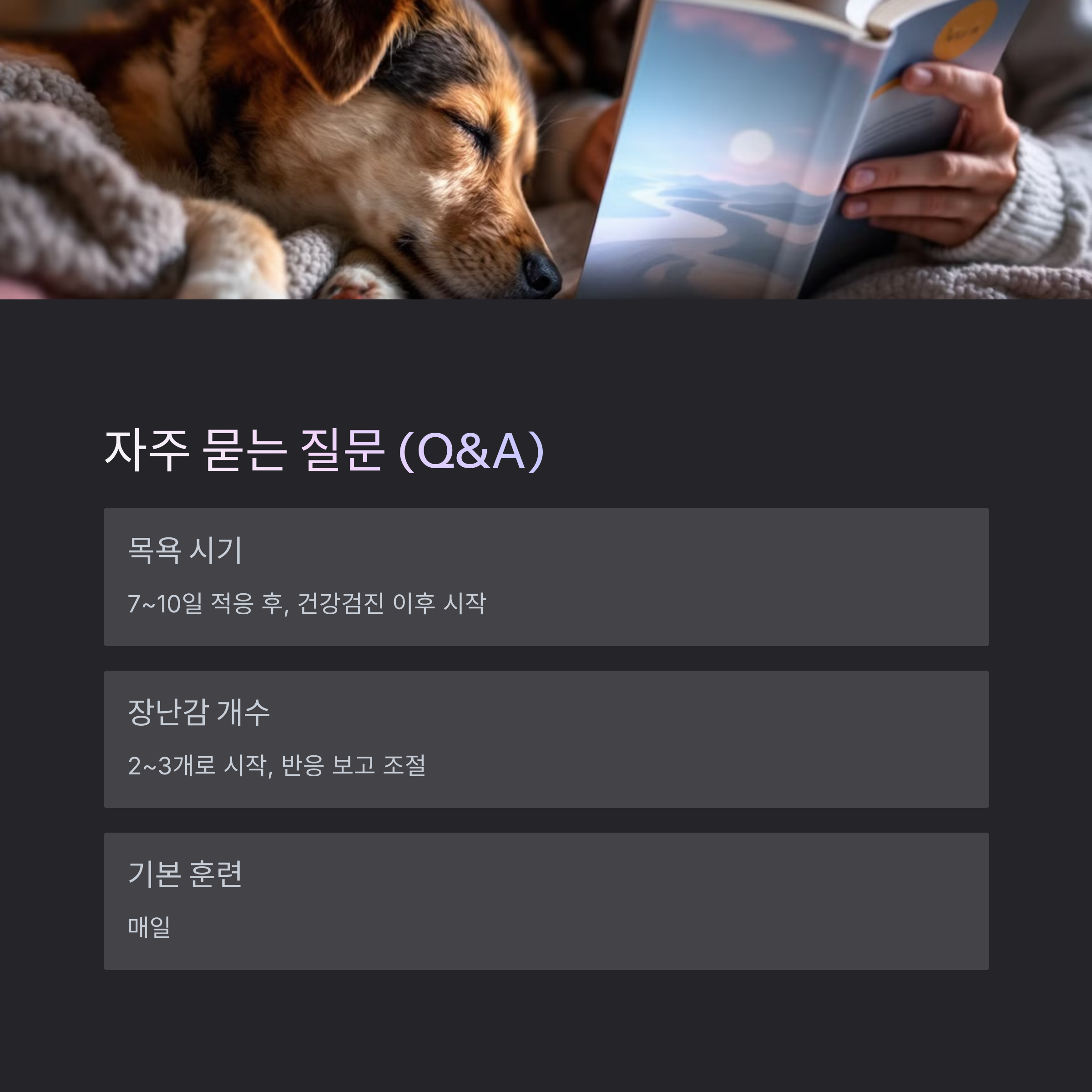 입양 첫 30일은 ‘반려’가 아니라 ‘적응’의 시기입니다. 서로의 언어를 배우고, 생활 패턴을 맞추고, 신뢰를 쌓아가는 시간이에요. 이 시기만 잘 넘기면 정말 따뜻한 반려생활이 열립니다. 마지막으로 제가 정리한 생존 팁들을 공유할게요.