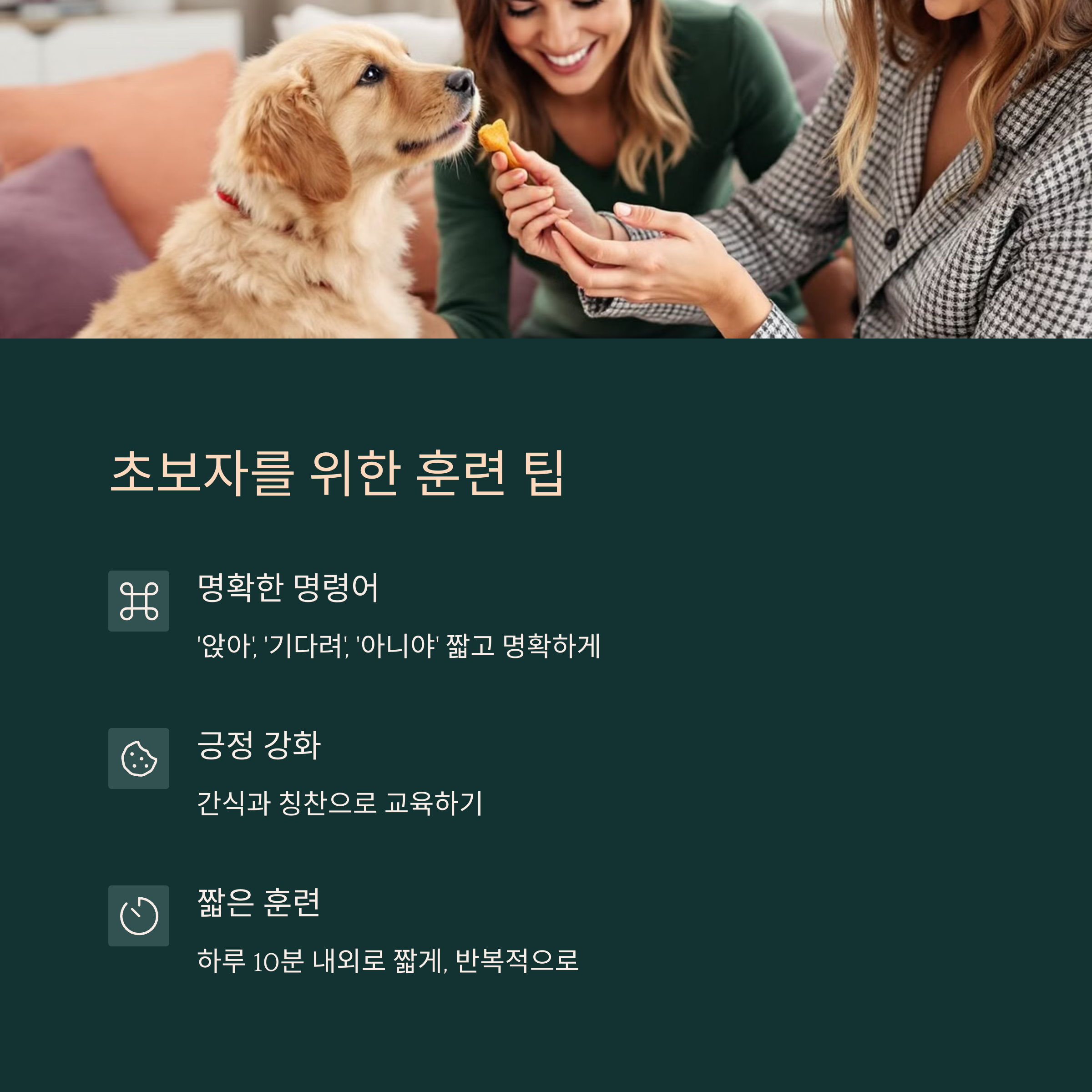 - ‘앉아’, ‘기다려’, ‘아니야’ 같은 명령어는 짧고 명확하게