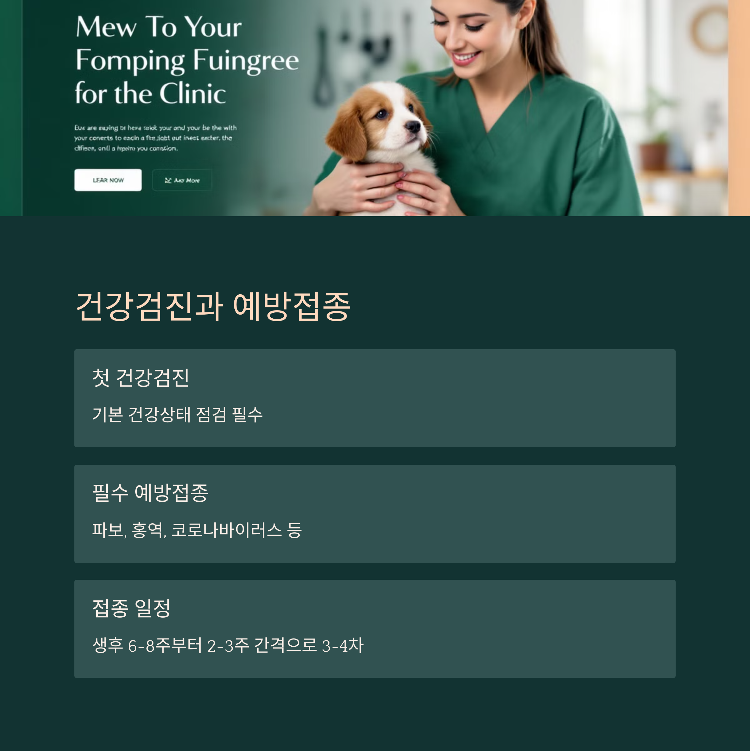 | 생후 6~8주 | 종합백신 1차 | 파보, 홍역 포함 |