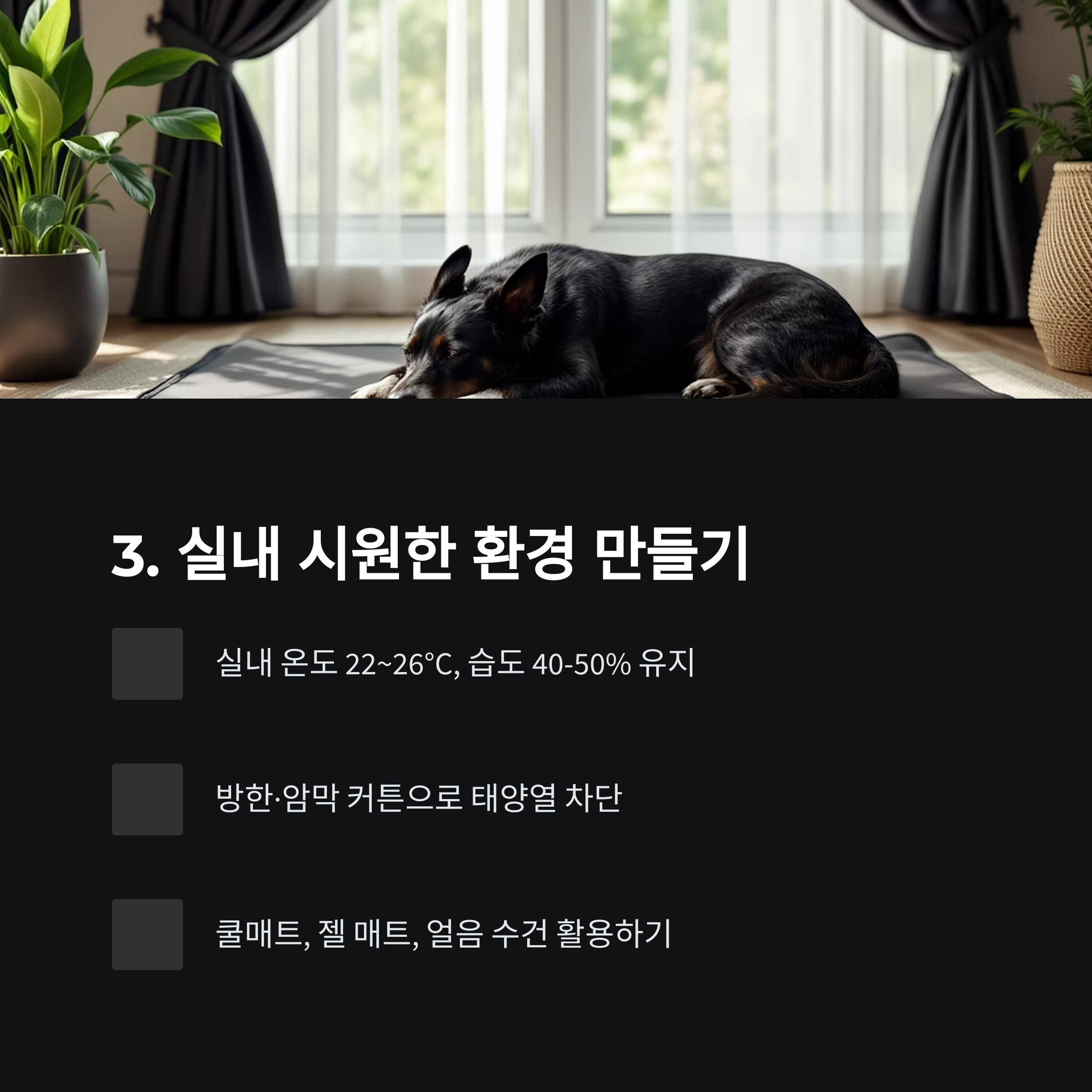 | 3 | 실내 온습도 22~26°C, 쿨매트·암막 커튼 활용 |