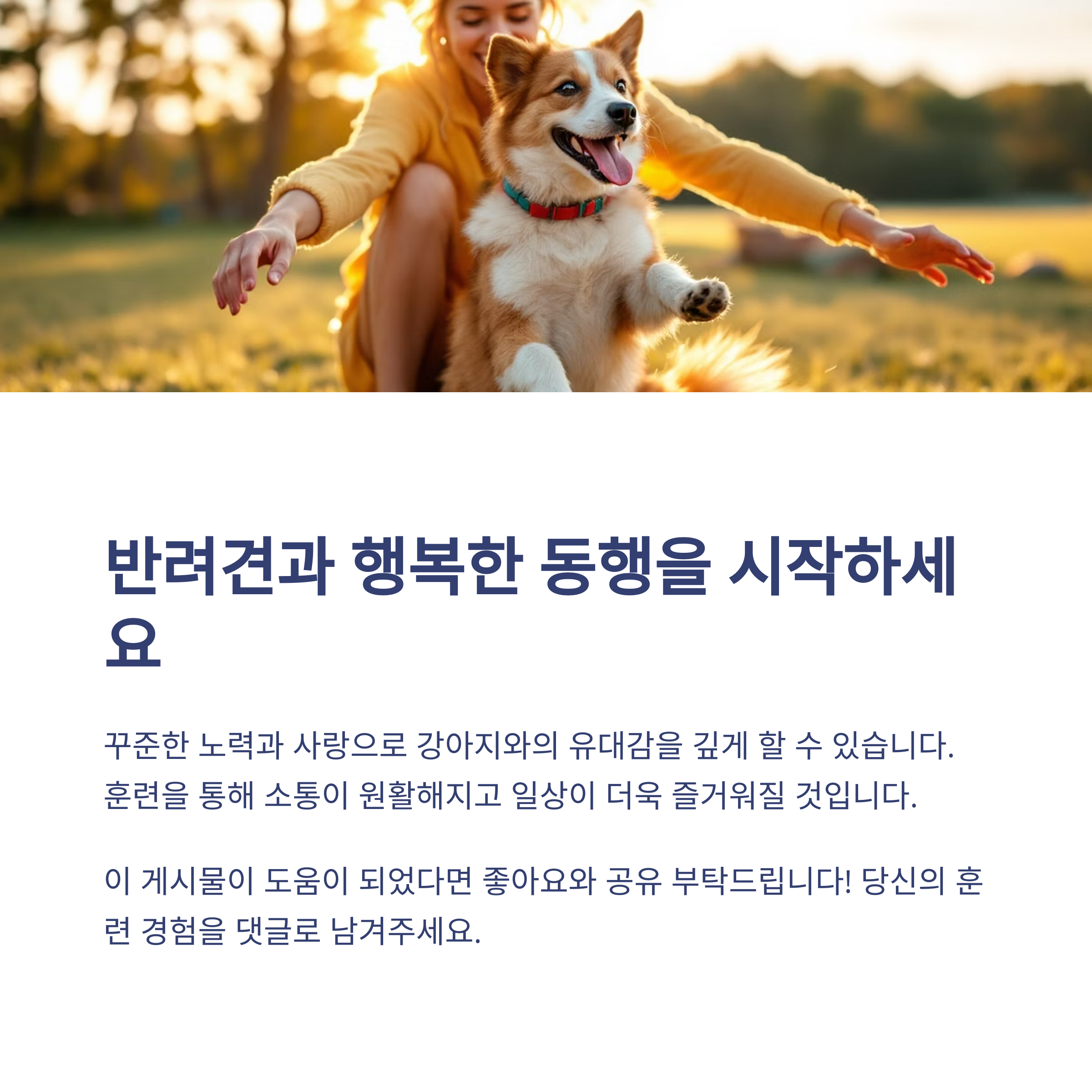 반려견과의 행복한 삶을 위해 기본적인 훈련은 필수입니다. 처음에는 어려울 수 있지만, 꾸준한 노력과 사랑으로 강아지와의 유대감을 깊게 할 수 있습니다. 훈련을 통해 강아지와의 소통이 원활해지고, 일상생활이 더욱 즐거워질 것입니다.