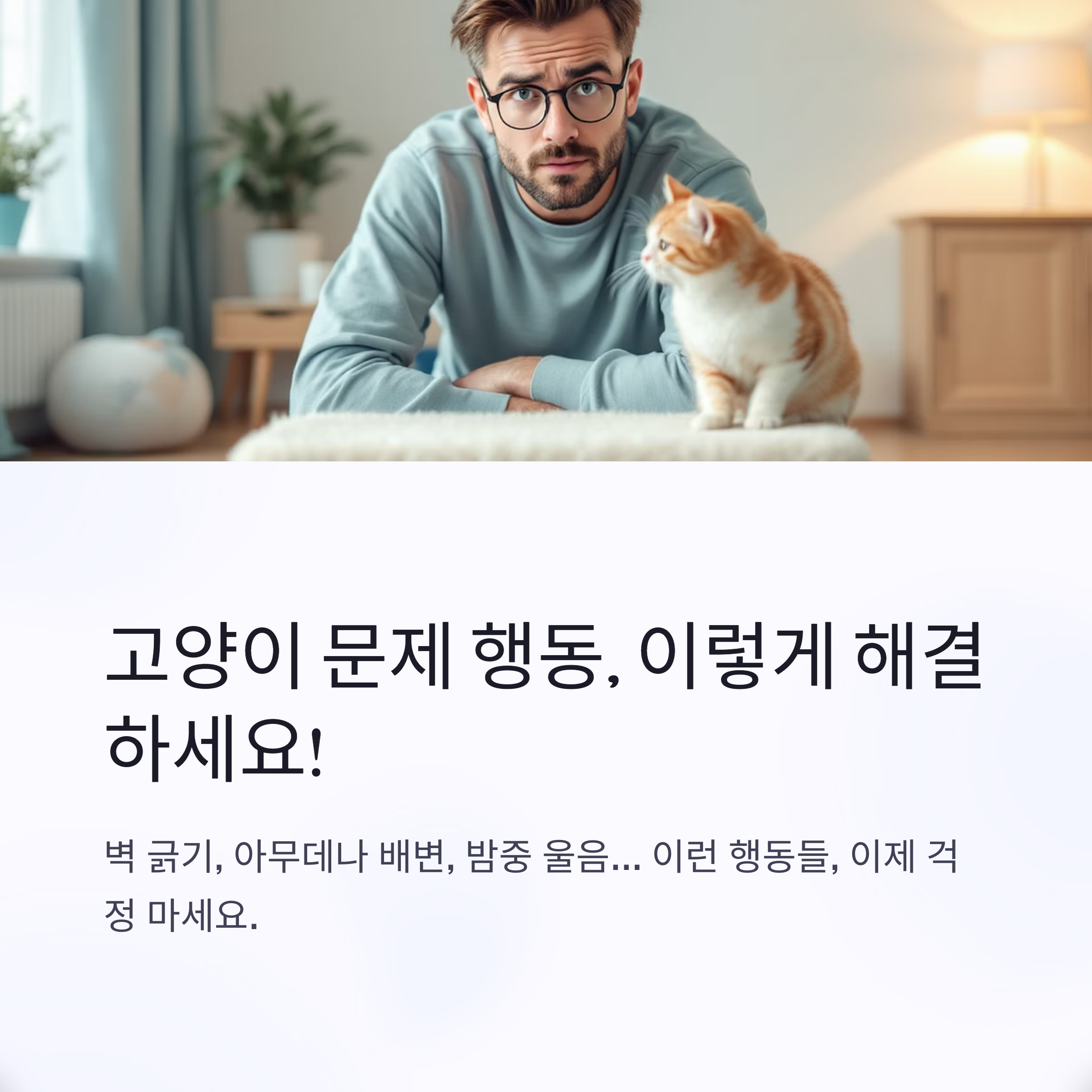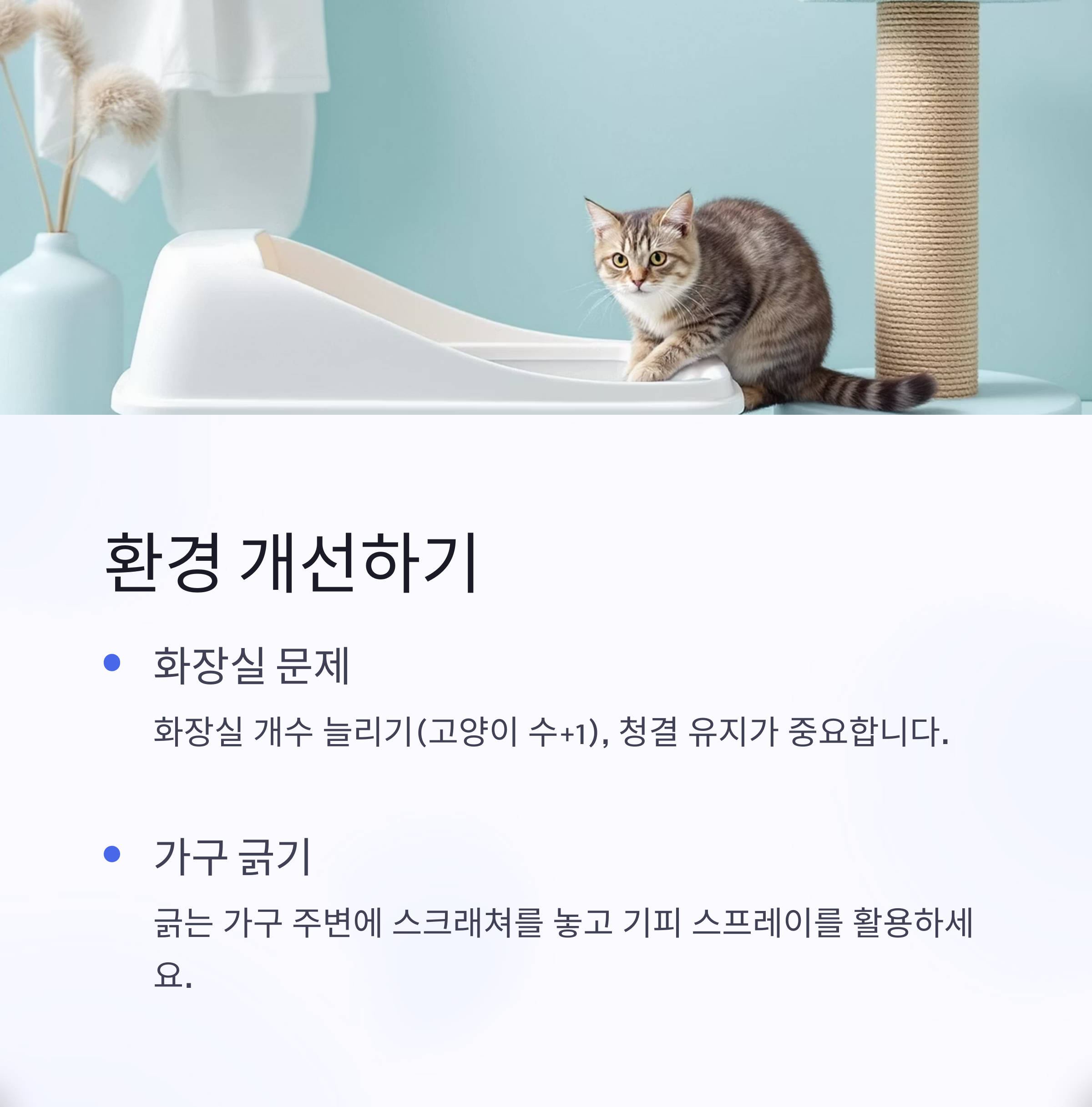 - 부적절한 배변: 화장실 개수를 늘리거나(고양이 수 +1), 모래 종류를 바꿔보거나, 화장실 위치를 바꿔보는 등 다양한 시도를 해보세요. 화장실 청결 유지도 매우 중요합니다.
