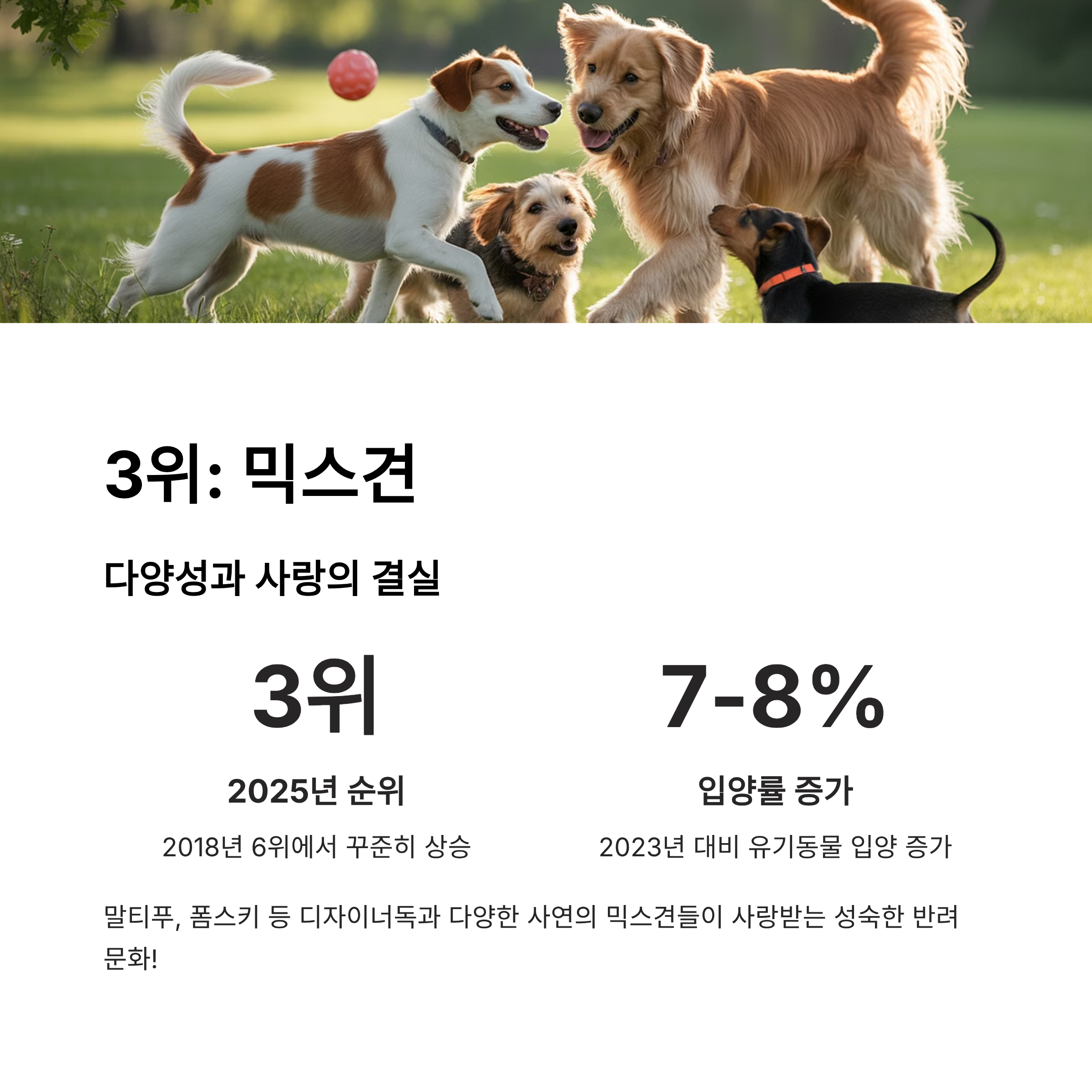 3위: 믹스견 (Mixed Breed) - 다양성과 사랑의 결실 믹스견이 2018년 6위에서 꾸준히 상승하여 당당히 3위에 올랐습니다. 말티푸, 폼스키처럼 의도적으로 교배된 디자이너독의 인기는 물론, 다양한 사연을 가진 믹스견들이 사랑받으면서 인기가 커지고 있습니다. 특히, 2023년 대비 유기동물 입양률이 7~8%가량 증가했다는 점은 단순한 순위 상승을 넘어, 반려인들의 성숙한 인식 변화를 보여주는 긍정적인 지표라 할 수 있습니다.