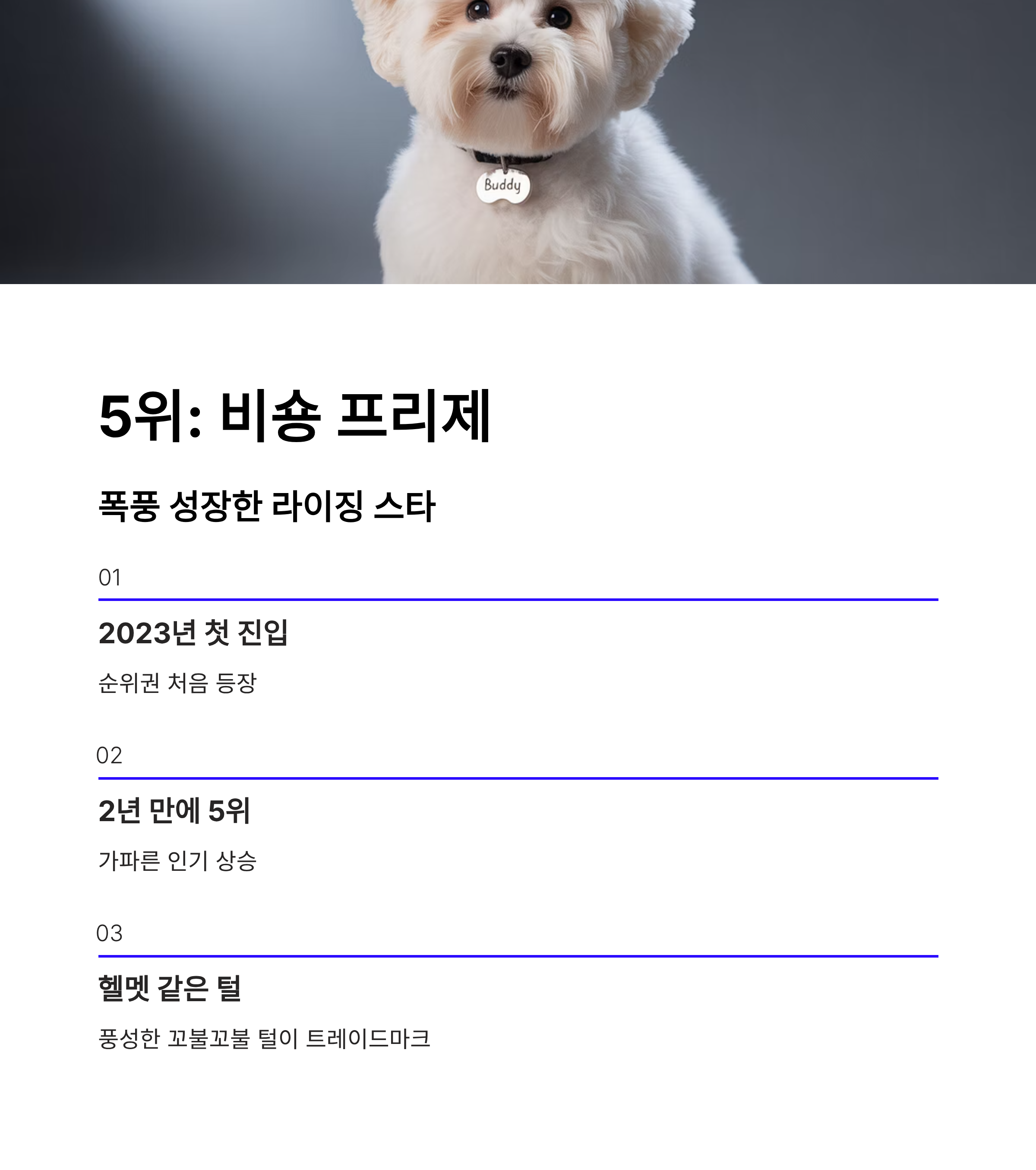 5위: 비숑 프리제 (Bichon Frise) - 한국인이 사랑한 라이징 스타 비숑 프리제는 최근 몇 년간 가장 눈에 띄게 순위가 상승한 견종입니다. 2023년에 처음 순위권에 진입한 후 불과 2년 만에 5위로 껑충 뛰어올랐죠. 비숑의 트레이드마크는 마치 헬멧을 쓴 듯한 풍성한 꼬불꼬불한 털입니다. 푸들과 마찬가지로 털이 잘 빠지지 않는다는 장점이 있지만, 푸들에 비해 골격이 크고 살이 잘 찌는 경향이 있어 체중 관리에 신경 써야 합니다. 애교가 많고 장난기도 심해 넘치는 에너지를 발산할 수 있는 충분한 놀이 시간이 필요합니다.