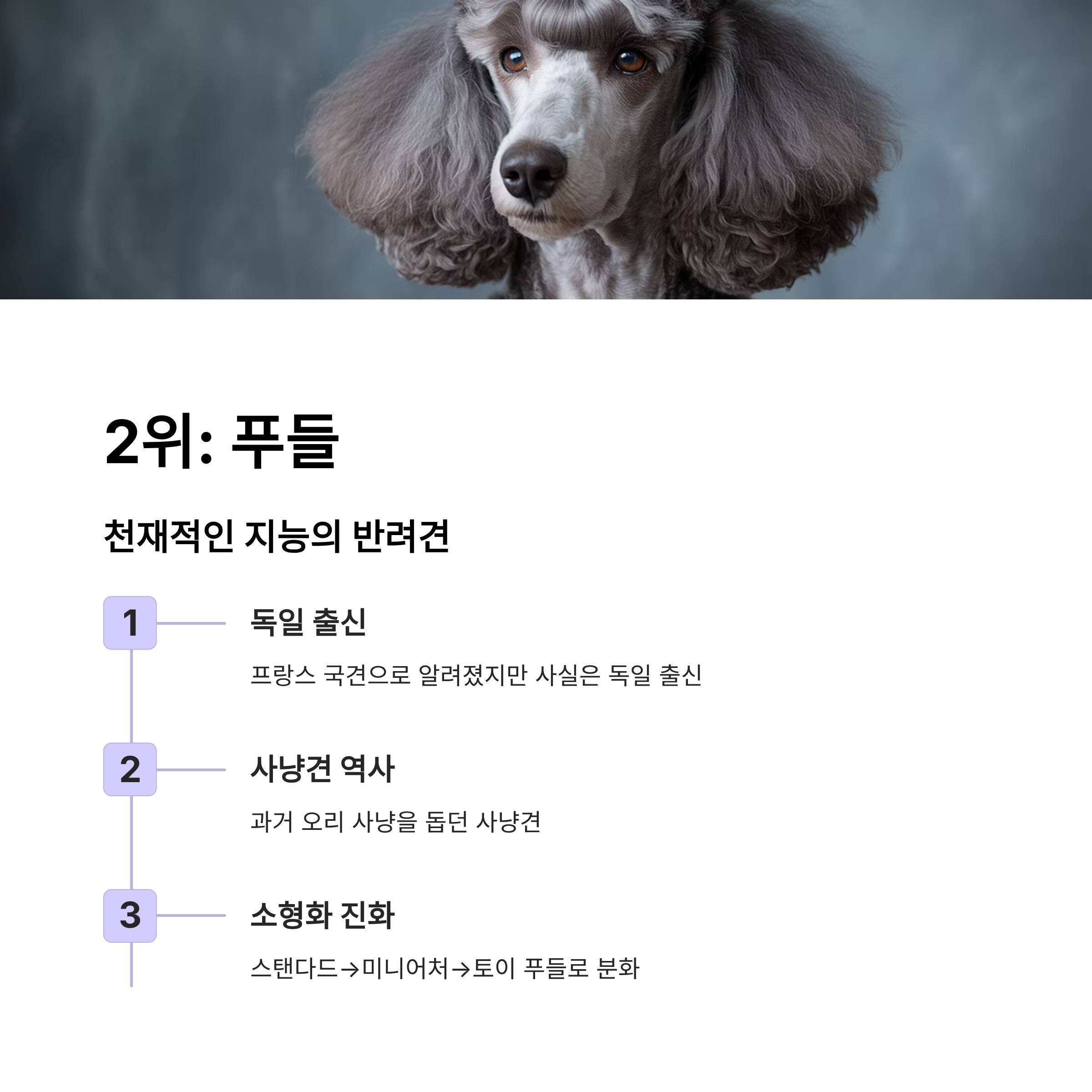 2위: 푸들 (Poodle) - 천재적인 지능을 가진 반려견 푸들은 뛰어난 지능과 재주를 가진 강아지입니다. 처음 강아지를 키우는 초보 보호자에게도 추천되는 견종이죠. 푸들은 흔히 프랑스 국견으로 알려져 있지만, 사실은 독일 출신으로, 과거에는 오리 사냥을 돕는 사냥견이었습니다. 이후 반려견으로 사랑받으면서 스탠더드 푸들에서 미니어처 푸들, 토이 푸들로 점차 소형화되어 다양하게 분화되었습니다. 너무 똑똑해서 때로는 보호자를 당황하게 만들 정도로 영리합니다.