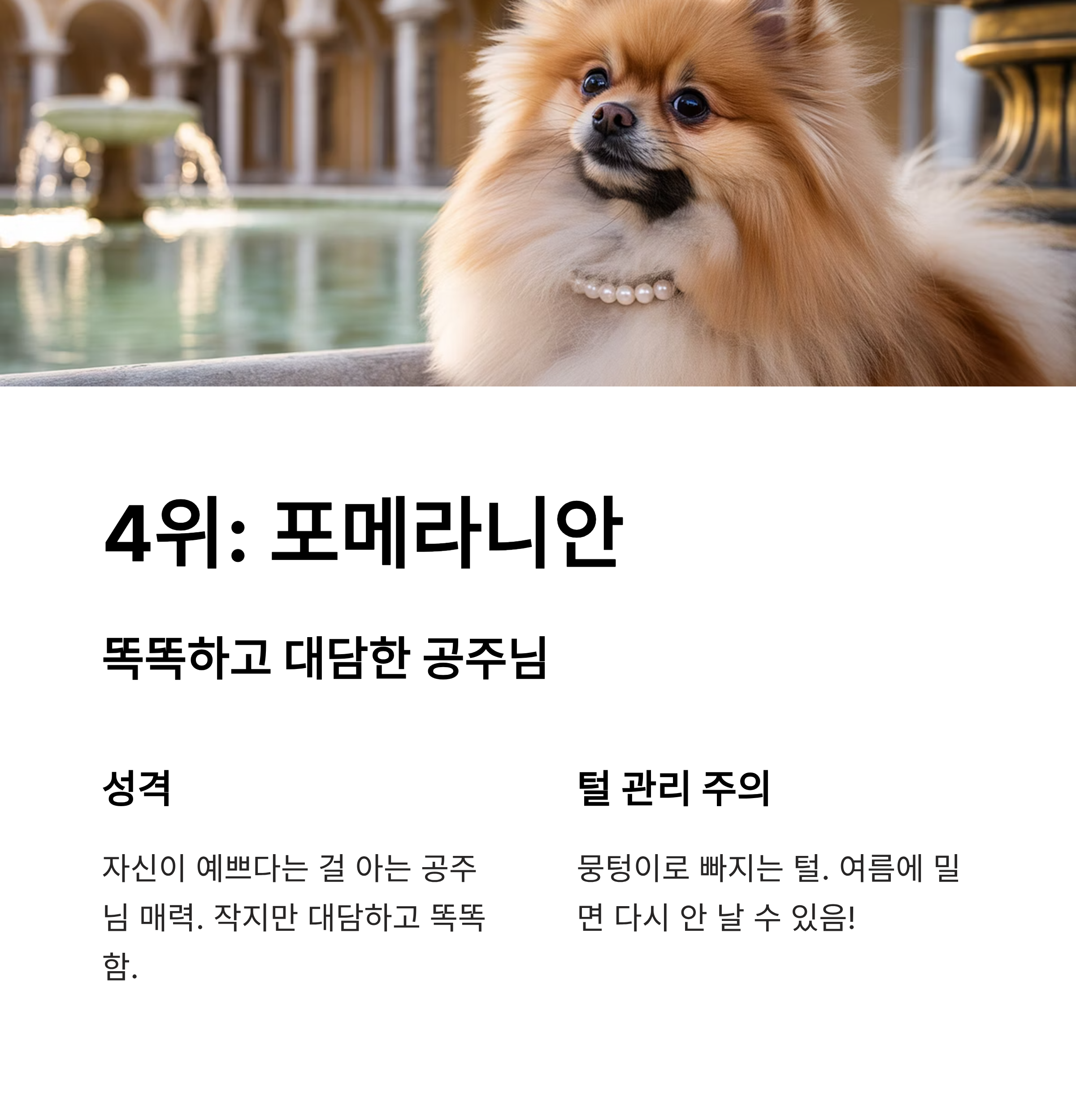 4위: 포메라니안 (Pomeranian) - 똑똑하고 대담한 공주님 포메라니안은 자신이 예쁘다는 사실을 너무나도 잘 아는 듯한 '공주님' 같은 매력을 가졌습니다. 작지만 똑똑하고, 큰 강아지에게도 기죽지 않고 달려드는 대담한 성격을 가졌죠. 털은 잘 날리지 않지만, 뭉텅이로 빠지는 편이라 집 구석구석에서 털 뭉치를 발견할 수 있습니다. 특히, 털갈이 시기나 여름에 털을 싹 밀어버리면 다시 털이 제대로 나지 않는 경우가 있으니 미용 시 주의해야 합니다.