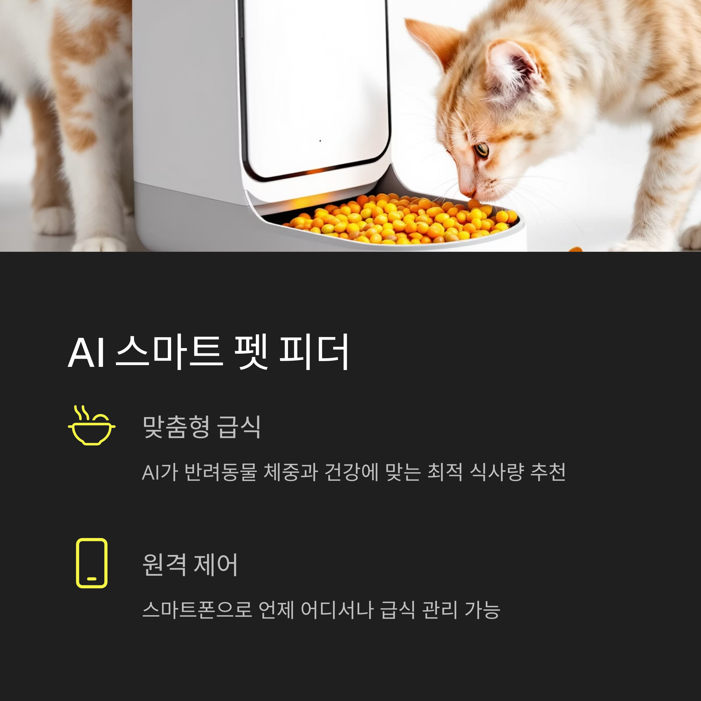기존의 단순한 자동 급식기를 넘어 AI 알고리즘이 반려동물의 식습관, 체중 변화, 건강 데이터를 분석하여 최적의 식사량과 급식 시간을 추천해줍니다. 실시간 모니터링이 가능하며, 스마트폰 앱으로 원격 제어할 수 있습니다. 대표 제품으로는 '페티오 스마트피더'와 '피코펫 AI 피더'가 있으며, 보호자의 일정이 바쁠 때도 반려동물의 식사를 체계적으로 관리할 수 있습니다.